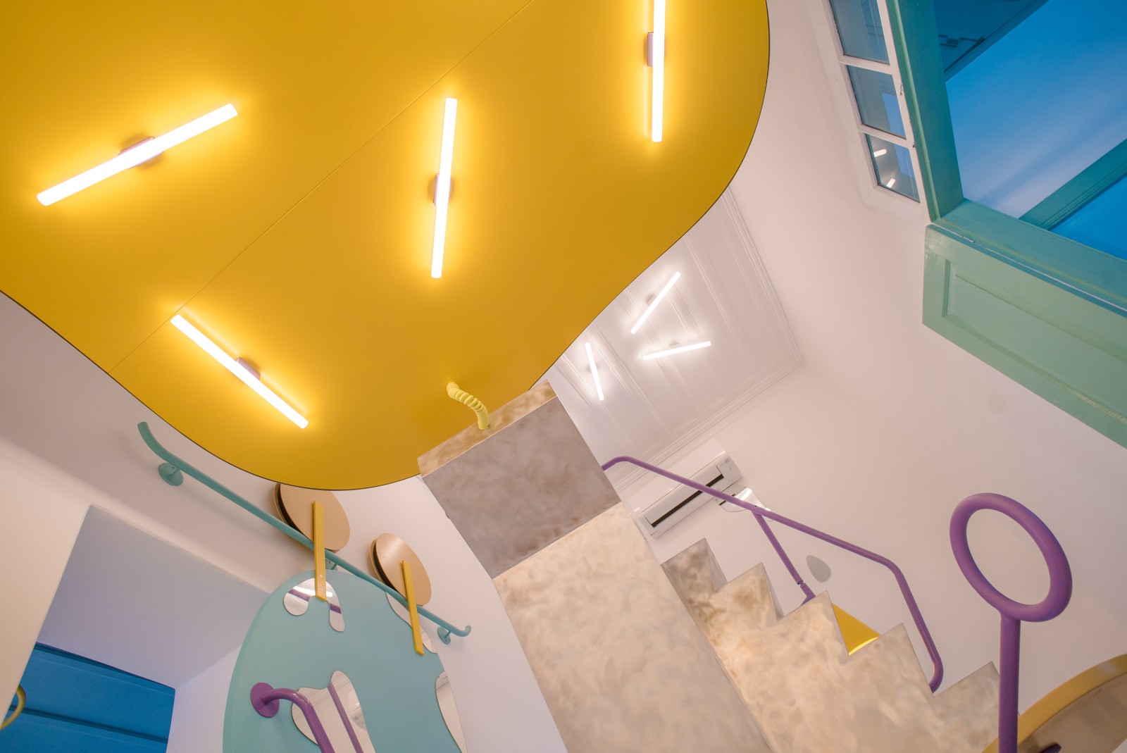 In der Mitte des Raumes scheint eine Raumfähre gelandet. Auf großen Teller-Füßen steht ein silbrig schimmernder Körper, der Schreibtisch, Schrank, Stehlampe und Treppe vereint und sicherlich auch über Ionentriebwerke verfügt. Bilder zeigen den LANDER auf den felsigen Gipfeln der Insel, auf anderen baumelt er an einem Hubschrauber der grichischen Marine. Ansonsten ist ungewiss, welche Reisen er hinter sich hat. An der Decke hängt ein Leuchter, zu dem man zum Schlafen hinaufklettern kann. Ein Spiegel lässt sich wegschieben und gibt den Zugang zum Badezimmer frei, das die Meereswelt um die Insel rekonstruiert, nachdem die echte Unterwasserwelt dem Dynamitfischen zum Opfer fiel. Nun lässt es sich zwischen funktionalistischen Korallen und Meeresschnecken in der Blauen Grotte duschen, während man auf dem Balkon in einer roten Wüste landet, die von künstlichen Pflanzen (und einheimischen Tieren) bewohnt wird.