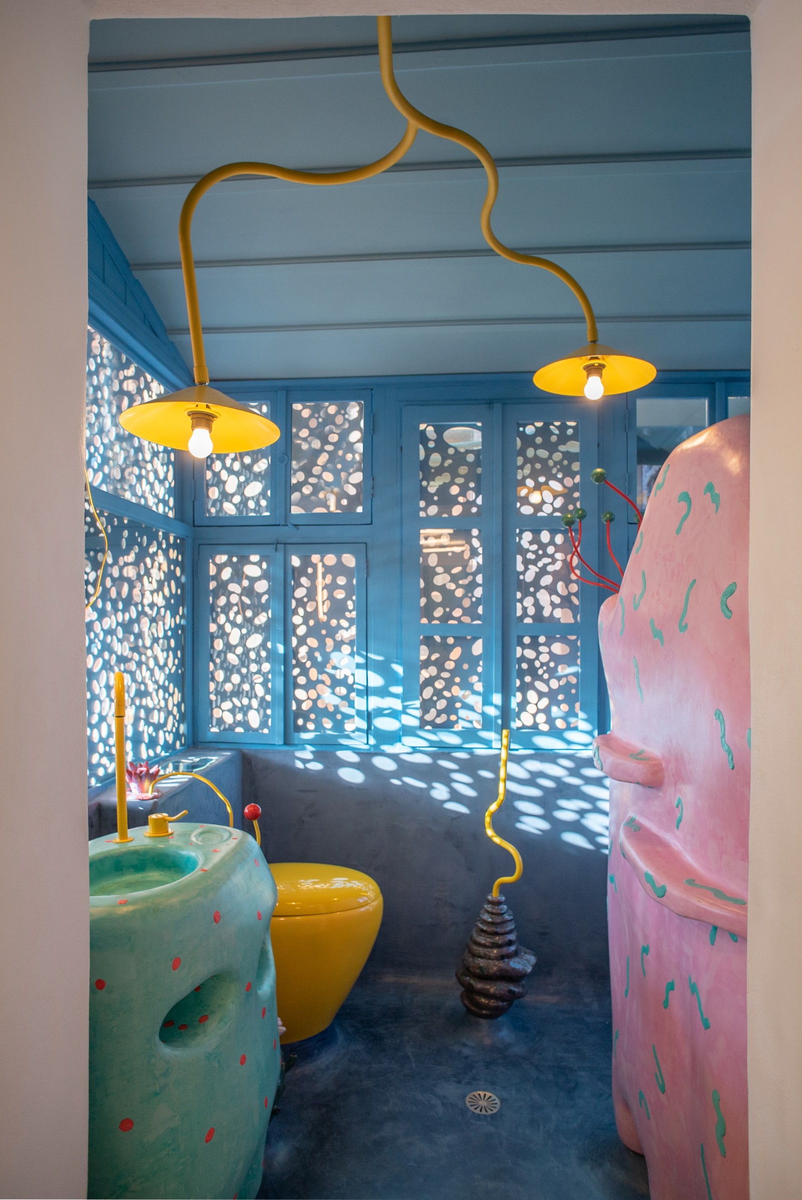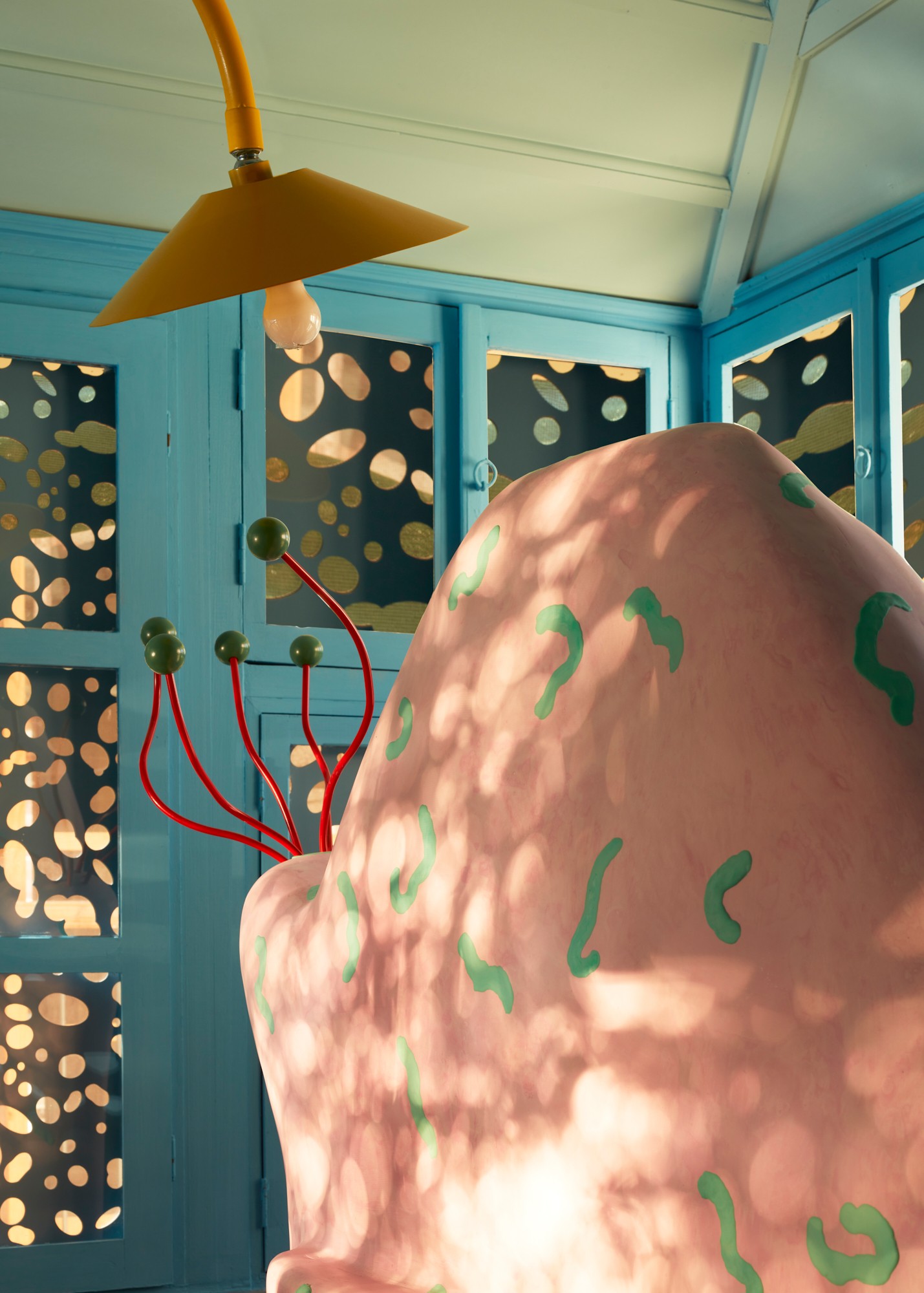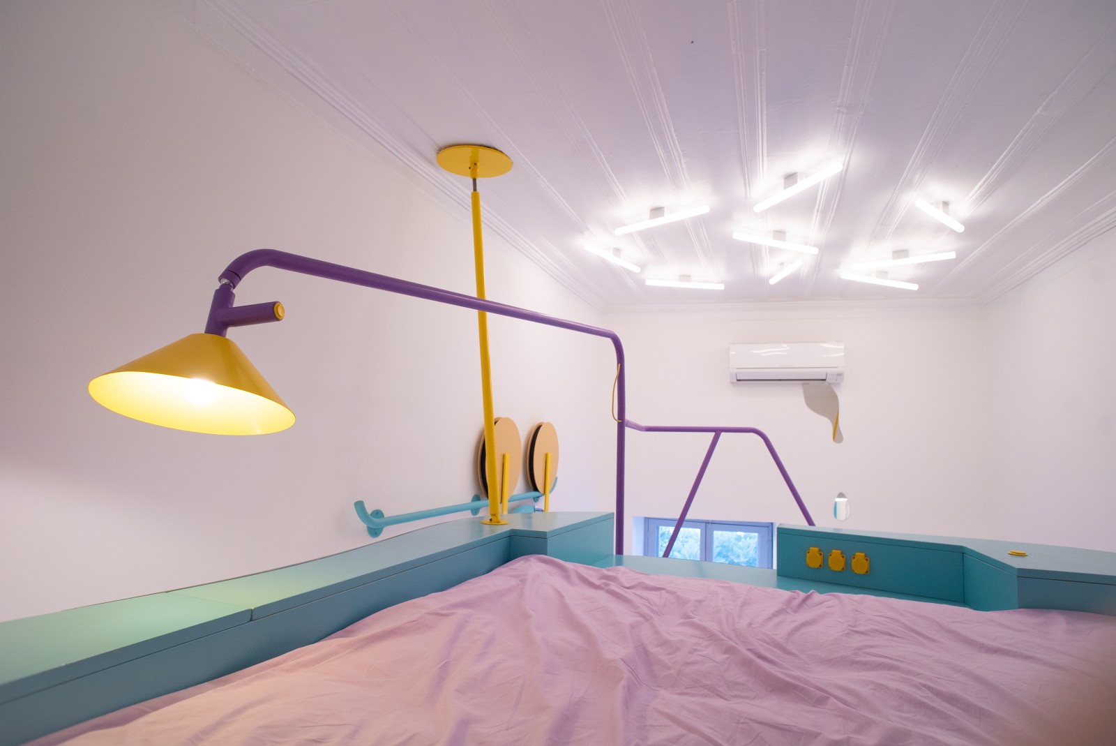 Die Möbel führen einen direkt zur Kernfrage der künstlerischen Produktion: Bin ich auf dieser winzigen Insel, um Urlaub zu machen? Gibt es Arbeit, die erledigt werden muss? Oder verwandle ich mich in eine Mischung aus Urlauber und kreativem Arbeiter? Über dieses süße Dilemma nachdenkend, bahne ich mir einen Weg über den Schreibtisch, um zurück in den Kronleuchter zu klettern, der zum Bett wird, sobald ich das Licht ausschalte.