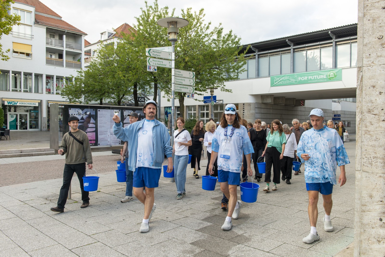 Im Kunstverein Friedrichshafen wird das Wasser aus Zürich gemeinsam mit den Besucher*innen der Ausstellung dem Bodensee zugeführt, um den Pegel wieder steigen zu lassen. Außerdem zeigt die Ausstellung die Dokumentation der Kampagne. Auf der Weltkarte sind die Wasserrationen zu sehen, die auf sich auf dem Weg zu ihrer Destination befinden. Manche sind nur wenige Stunden unterwegs, andere werden erst in 50+ Jahren eintreffen.