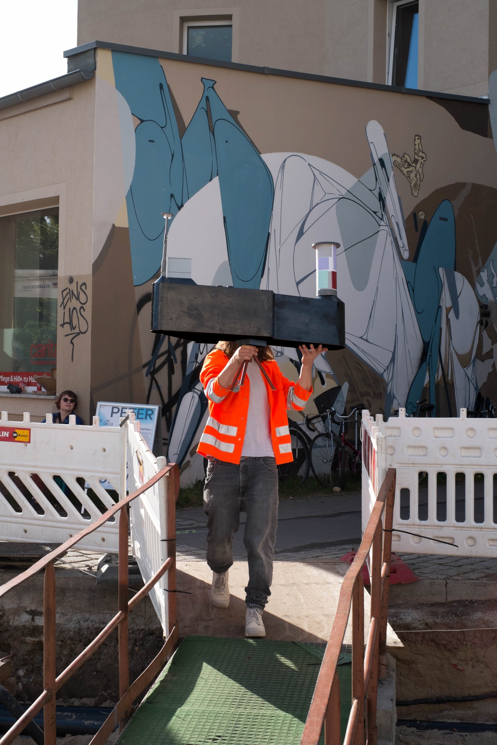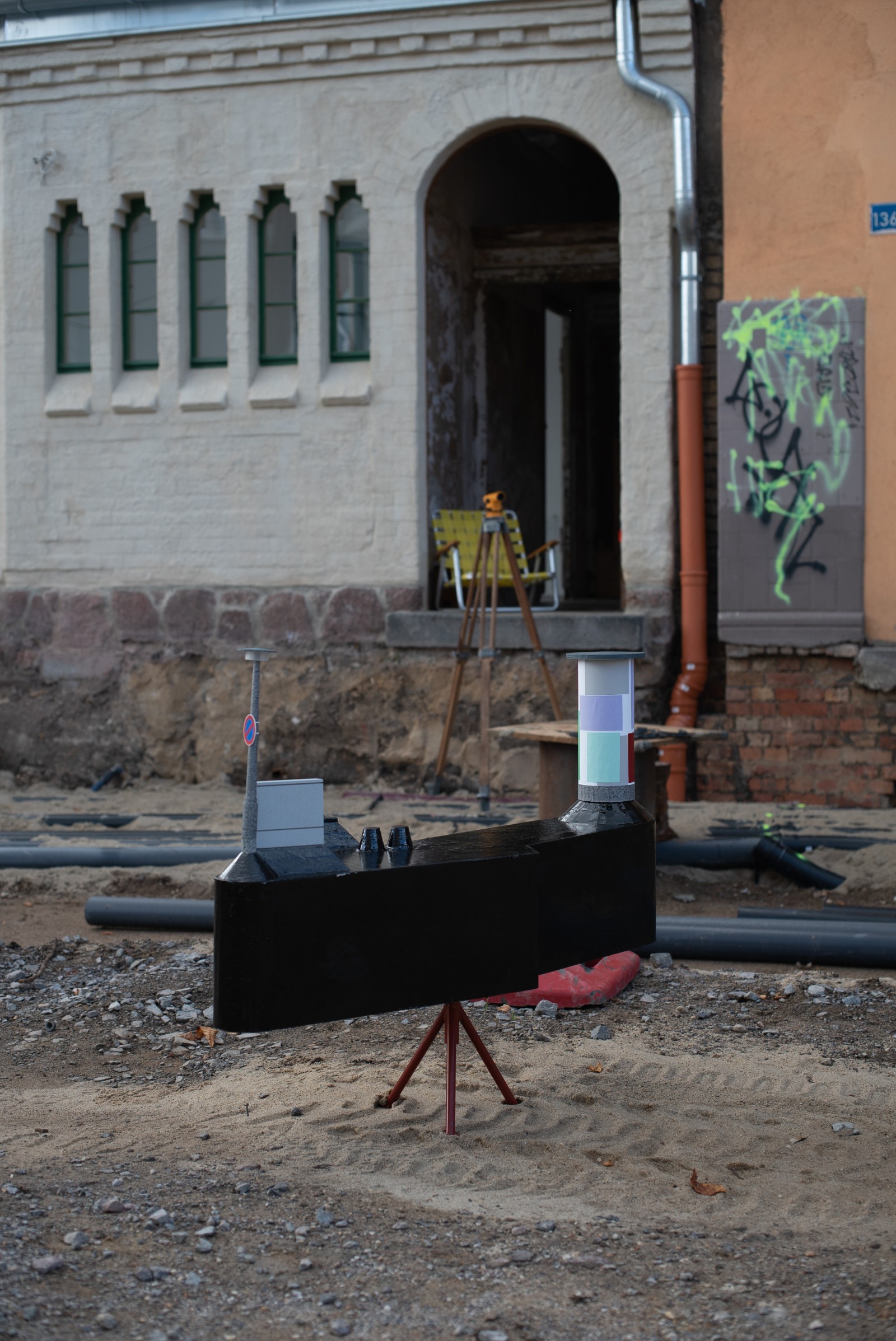 In seiner Installation “Submarines” entwirft Peter Behrbohm ein immersives Narrativ, das die Besucher*innen zu einer Entdeckungsreise in den Untergrund einlädt. Wie sich herausstellt, scheinen Gullydeckel, Poller, Fundamentreste, Kioske, Lüftungsschächte, Trafohäusschen etc. längst wider Erwarten zusammenzugehören. Die alltäglichen Teile der Stadt dienen lediglich als getarnte Fühler, Schnorchel oder Zugänge in eine dystopische Parallelwelt. Vor den Augen der Öffentlichkeit ist im Untergrund ein System aus Angsträumen gewachsen, das jenen als Rückzugsort dient, die den nervösen Zeiten zu entfliehen versuchen. Welchen Plan verfolgt man im Untergrund? Stehen die Räume miteinander im Kontakt? Ist das Bedürfnis gar Teil des Netzwerks?