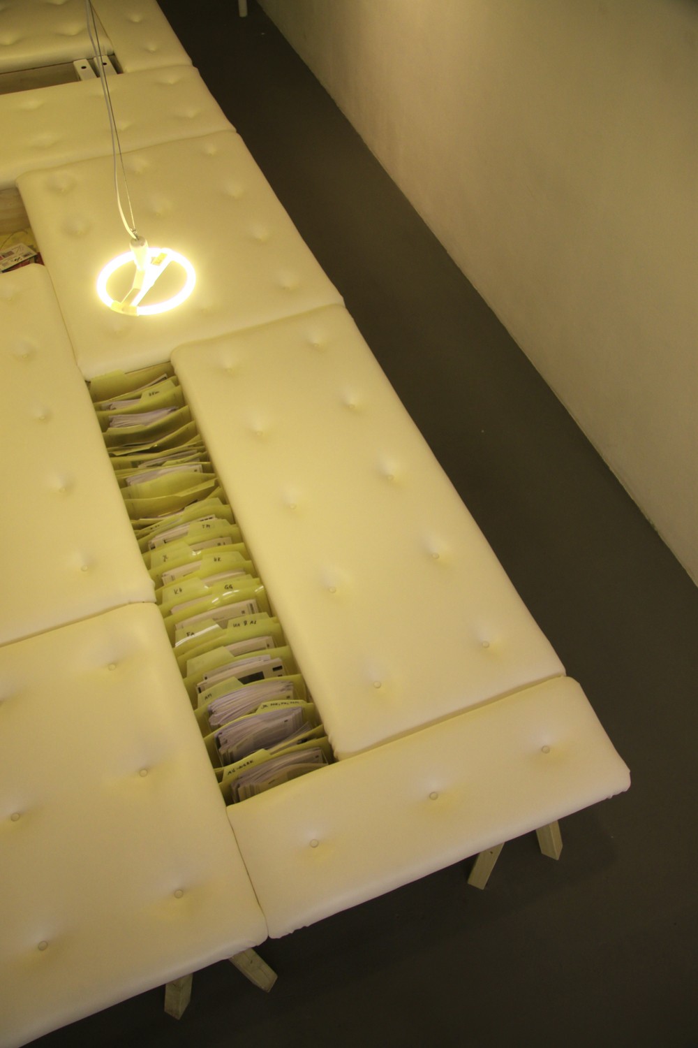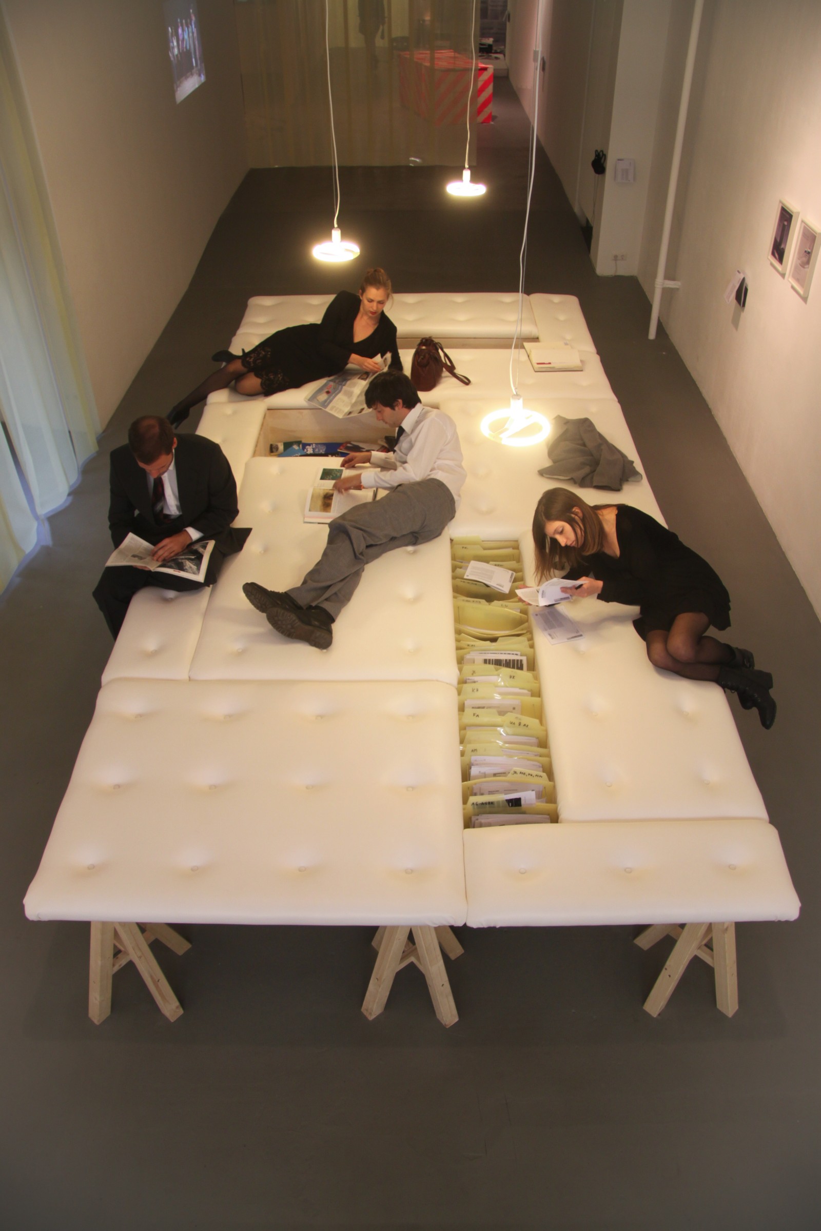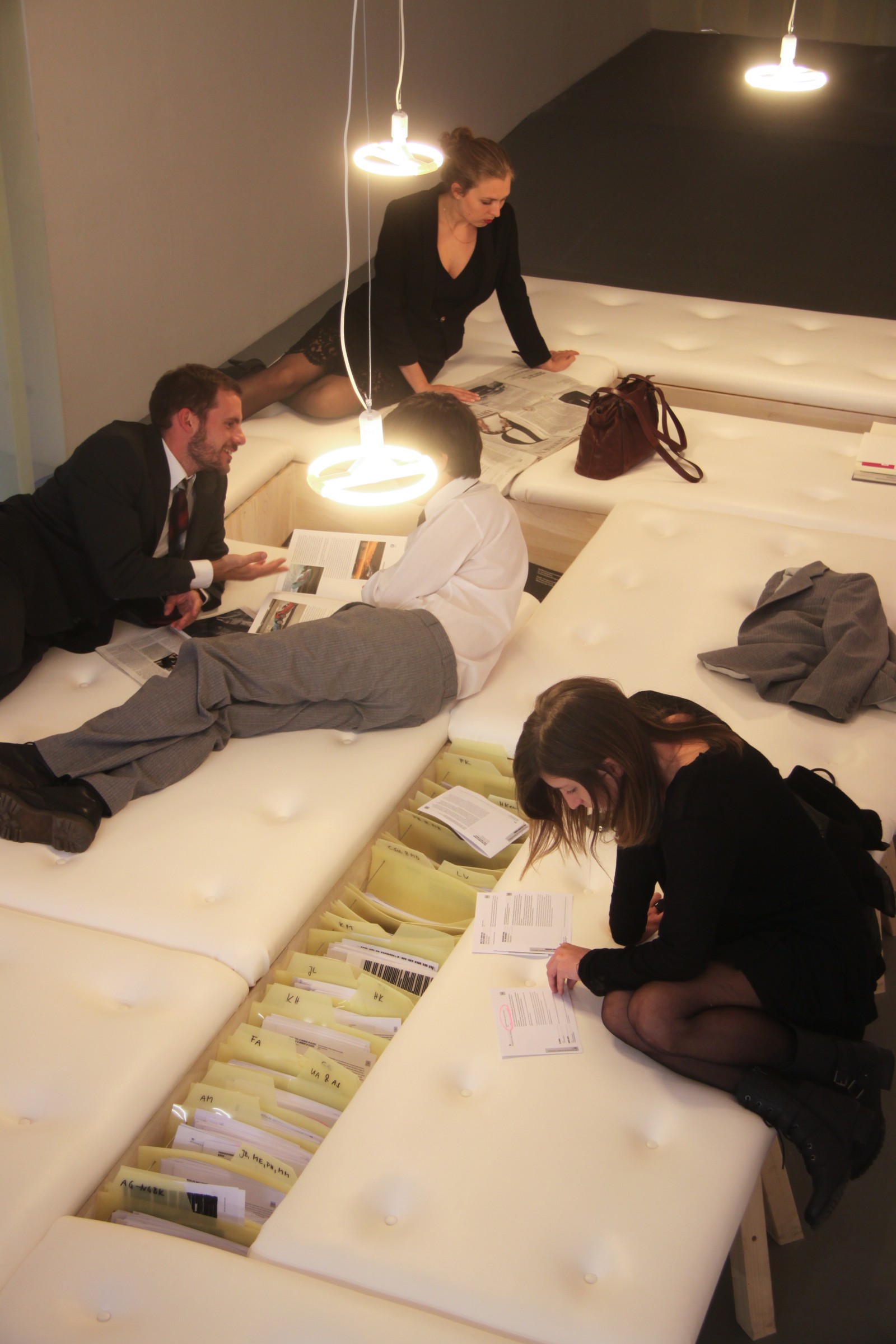 Das "Arbeitslager" ist ein Ausschnitt dieser Welt; sozusagen ihr Muster. Sofalandschaft, Großraumbüro und Bodenbelag zugleich. In den Fächern stecken Aktenordner, Fachbücher und Hängeregister, auf dem Polster aalen sich Menschen mit Sektgläsern und blättern sich angeregt durch das Informationsangebot. Zwischen Arbeitswelt und Freizeit besteht keine Differenzierung mehr. Im Urlaub werden Firmenmails, im Büro Freundschaftsanfragen beantwortet. Ein diffuser Zustand zwischen idealer Realität und Kontrollverlust. Die programmierte Selbstaufgabe ist einzig ihrer technischen Realisierbarkeit geschuldet. Sie sind Protagonisten einer undifferenzierbaren Ebene sozialen Daseins; gefangen in einer Momentaufnahme zwischen domestischer Behaglichkeit, zermürbender Selbstdarstellung und Knochenarbeit.