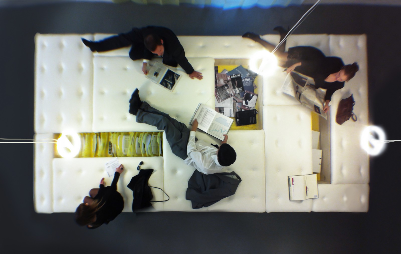 Bis an den Horizont erstreckt sich das Raster aus weiß gepolstertem Leder mit bezogenen kleinen Knöpfen unter einem sommerlichen Abendhimmel. Überall liegen Menschen herum, schlafend oder voller Anspannung arbeitend. Wie kleine Fehler im Raster verteilt, sind private Lebens- und Arbeitsfächer im gepolsterten Boden eingelassen. Einige der unentwegt beschäftigten Menschen hängen über einem der Fächer und wühlen sich durch Akten oder kopulieren. Wieder andere liegen auf riesenhaften Interfaces, an denen sie ohne Unterlass Informationen aufnehmen - verarbeiten - weiterleiten. Ein paar betrunkene Geschäftsleute ziehen irritiert an einer Lachyoga Gruppe vorbei. Hier und da sieht man Handwerker, die ein paar gepolsterte Rasterelemente herausbrechen und eine Kiste einsetzen, wenn Stauraum beantragt wurde. Sie sind die einzigen, bei denen man mit Gewissheit sagen kann, dass sie arbeiten, denn wer weiß, ob es sich bei den Anderen um Architekt*innen oder Verrückte, Künstler*innen, Tagediebe, Prostituierte, Verkäufer*innen, Betrüger oder Anwält*innen handelt?