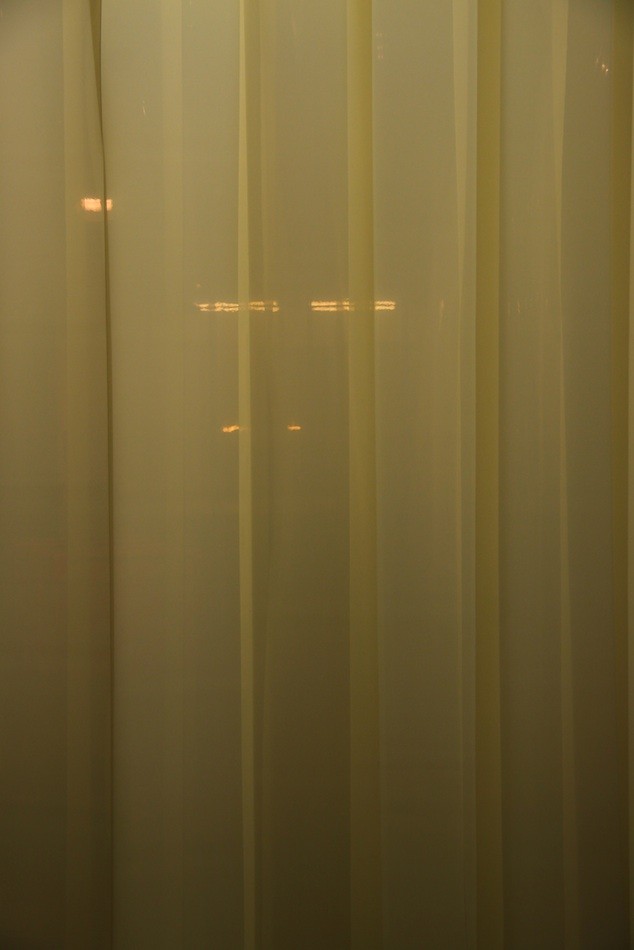 In unregelmäßigen Abständen unterteilen hohe Vorhänge aus gelblich-transparenten PVC-Streifen die Weite in fassbare Raumsegmente. Die endlose Ebene zergliedert sich in ein mehrdimensionales Geflecht. Ein offenes Netzwerk aus Gemeinschaften und Identitäten zwingt den Menschen seine Privatsphäre aufzugeben. Alles bleibt für Jeden begehbar, wenn man sich erst einmal durch die Vorhänge in eine andere Identität zwängt, wie durch die Häute einer Zwiebel.