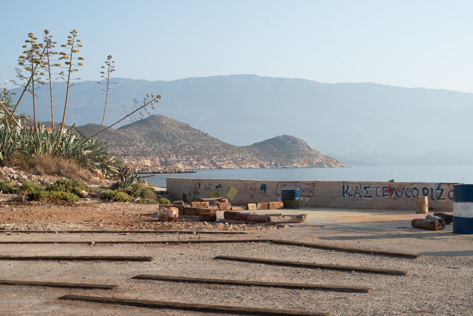 Um nach Kastellorizo zu gelangen, fliegen wir nach Rhodos und nehmen am nächsten Morgen eine Fähre, die am Abend endlich die kleine Insel anläuft. Obwohl Teil der Europäischen Union, scheint es nicht wesentlich anstrengender zu sein, zum Mond zu fliegen, als in Kastellorizo von Bord zu gehen. Auf der Insel erwarten einen unzählige Ruinen und kaum Infrastruktur. Die Militärbasis verkauft ausgewählte Baumaterialien und Getränke. Wer morgens Elektriker ist, kann schon abends Fischer oder Polizist sein. Benötigt man mehr, als der kleine Einkaufsladen zu bieten hat, lohnt es sich am Heck der Segelyachten zu klopfen, die im Hafen liegen. Alles hier scheint mehrere Funktionen zu haben.