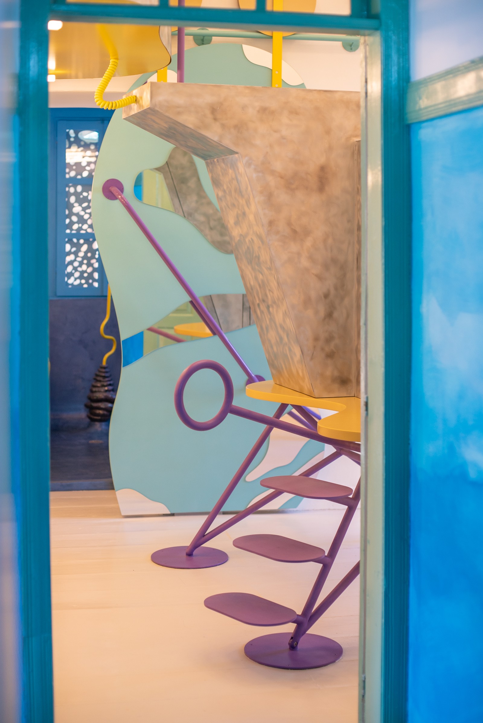 In der Mitte des Raumes scheint eine Raumfähre gelandet. Auf großen Teller-Füßen steht ein silbrig schimmernder Körper, der Schreibtisch, Schrank, Stehlampe und Treppe vereint und sicherlich auch über Ionentriebwerke verfügt. Bilder zeigen den LANDER auf den felsigen Gipfeln der Insel, auf anderen baumelt er an einem Hubschrauber der grichischen Marine. Ansonsten ist ungewiss, welche Reisen er hinter sich hat. An der Decke hängt ein Leuchter, zu dem man zum Schlafen hinaufklettern kann. Ein Spiegel lässt sich wegschieben und gibt den Zugang zum Badezimmer frei, das die Meereswelt um die Insel rekonstruiert, nachdem die echte Unterwasserwelt dem Dynamitfischen zum Opfer fiel. Nun lässt es sich zwischen funktionalistischen Korallen und Meeresschnecken in der Blauen Grotte duschen, während man auf dem Balkon in einer roten Wüste landet, die von künstlichen Pflanzen (und einheimischen Tieren) bewohnt wird.