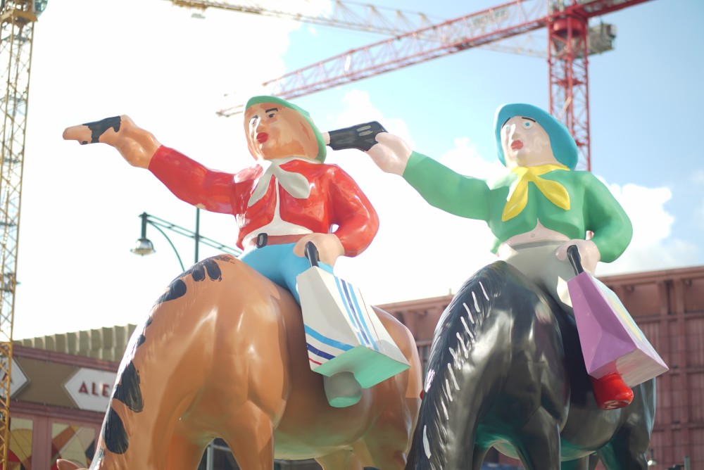 Zwei Schurken aus dem Wilden Westen reiten auf dem Mittelstreifen der sozialistischen Prachtstraße gen Osten. Sie sind mit gezogenen Colts auf Shoppingtour, um auf den letzten Freiräumen der Stadt ihre Claims abzustecken. Den Passanten kommen die Typen bekannt vor - und wirklich: es sind auf Überlebensgröße hochskalierte Spielzeugcowboys aus ostdeutscher Produktion - imperialistische Klassenfeinde aus Gummi also, während sich Bürger der DDR mit den Ureinwohnern Nordamerikas solidarisierten und als 'Indianisten' sprichwörtlich in Federschmuck und Tipis schlüpften. Die Cowboy- und "Indianer"-Figuren machten aus dem Überlebenskampf zwischen Büffelherden einen Klassenkampf und brachten ihn in den 1960ern en-miniatur in die Buddelkästen und Kinderzimmer.