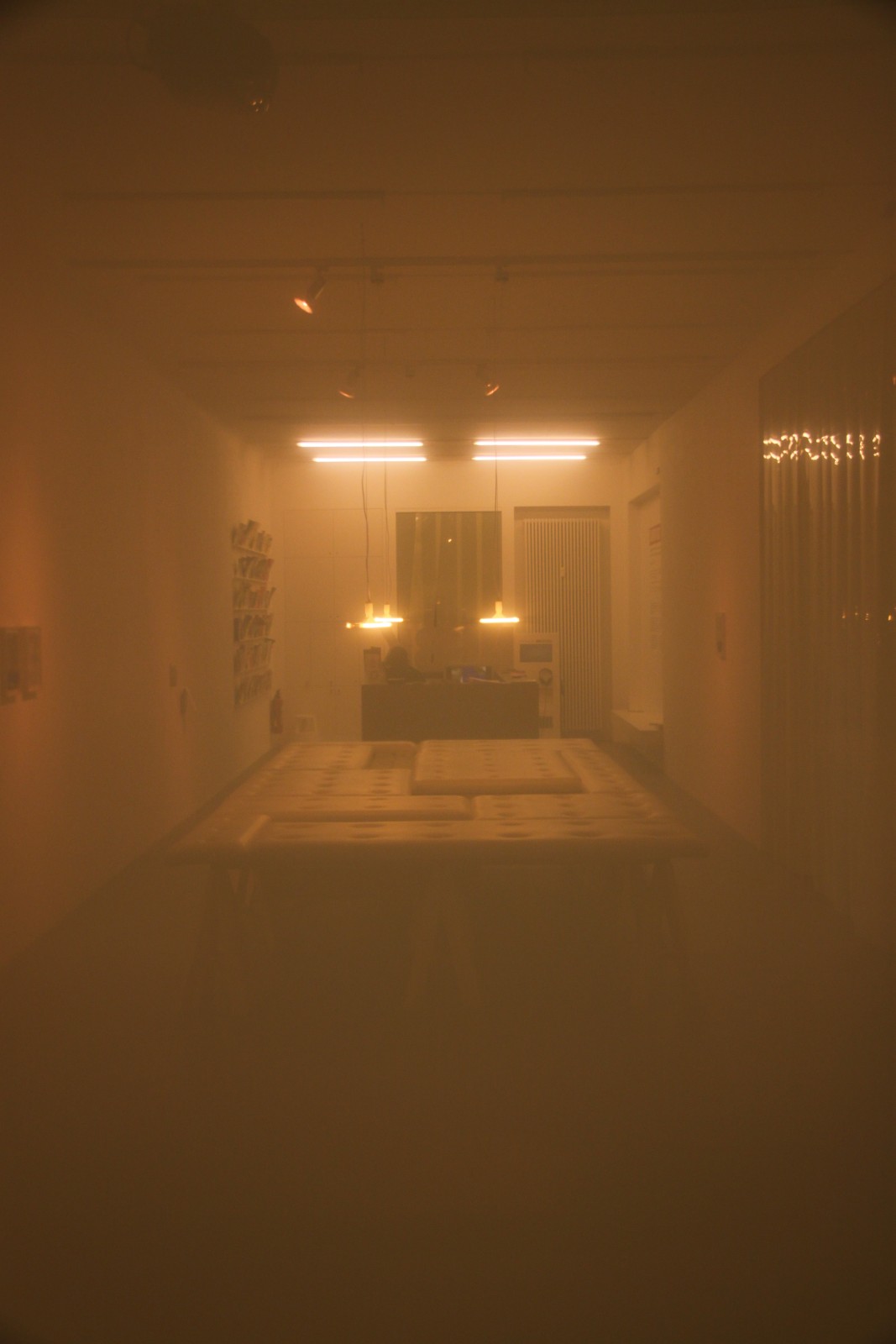 At irregular intervals, high curtains made of yellowish-transparent PVC strips divide the vastness into graspable spatial segments. The endless plane is broken down into a multidimensional web. An open network of communities and identities forces people to give up their privacy. Everything remains accessible to everyone once you force yourself through the curtains into another identity, as if through the skins of an onion.
