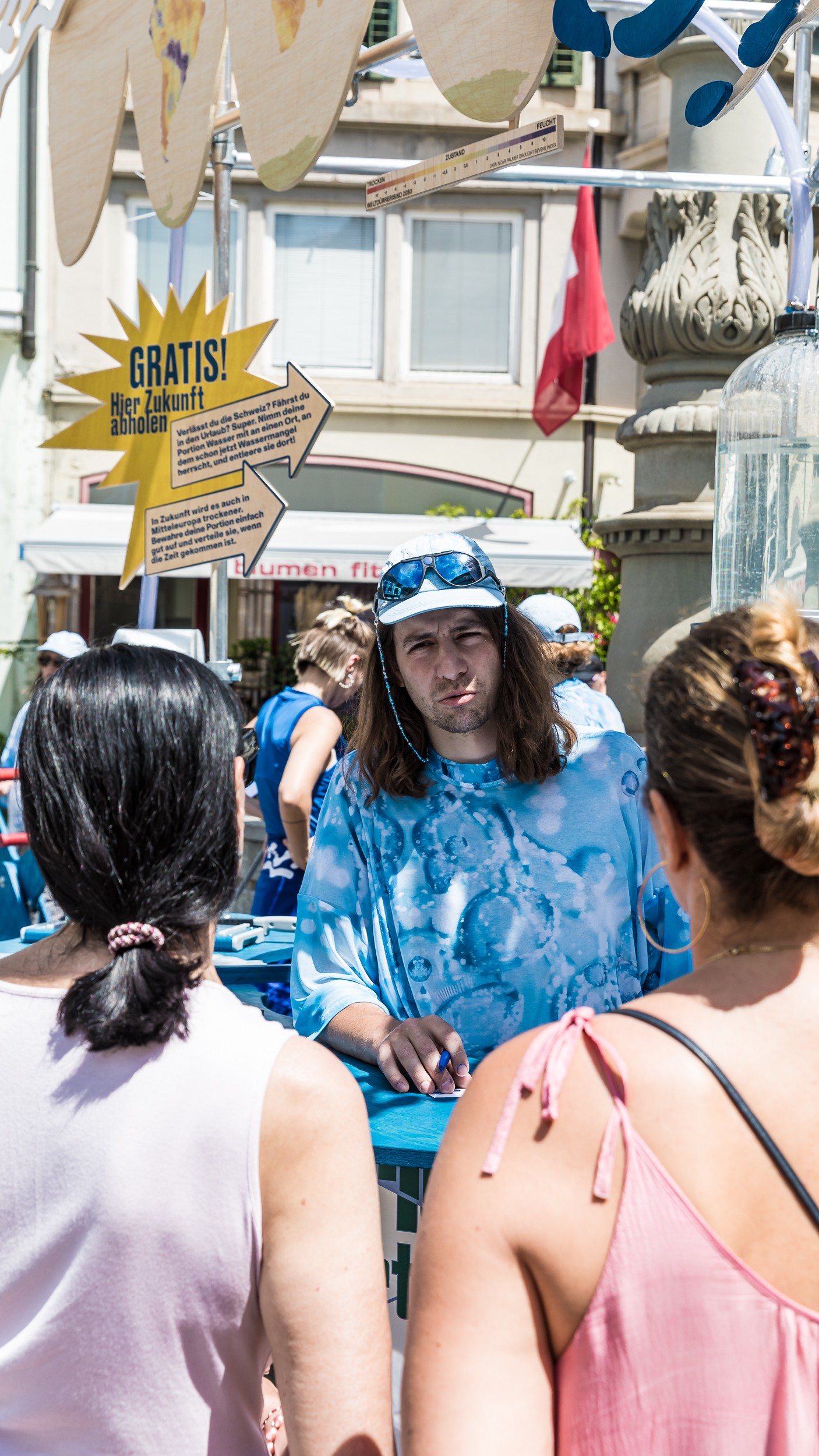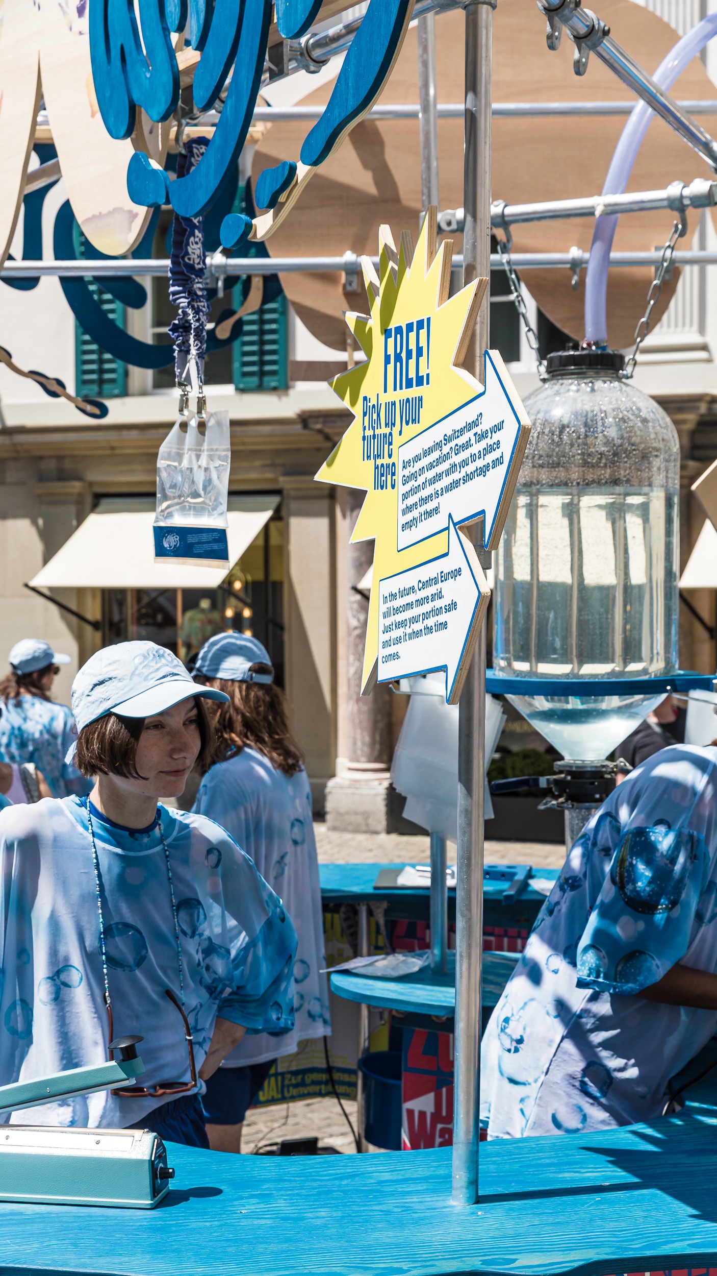 Passers-by bring water from nearby wells in buckets before conveying it to the buffer tank with a hand pump. From there, it is bottled in small, medium or large bags, depending on the order. "Flight Portion to Tokyo, August twentysixtynine? It's ready. Thank you for your generous support!‘ Passers-by are asked to redistribute the water and give us their word. Either spatially, temporally or on both axes. ‘Are you going on holiday soon to a place threatened by drought? Or are you staying in Zurich? Can you store this resource, which is steadily increasing in value, for one, two or three decades? What about your grandchildren? Wouldn't it be nice if they took your portion of water, filled up back in 2025 to water the apple tree that you planted in... let's say the summer of 2085?"