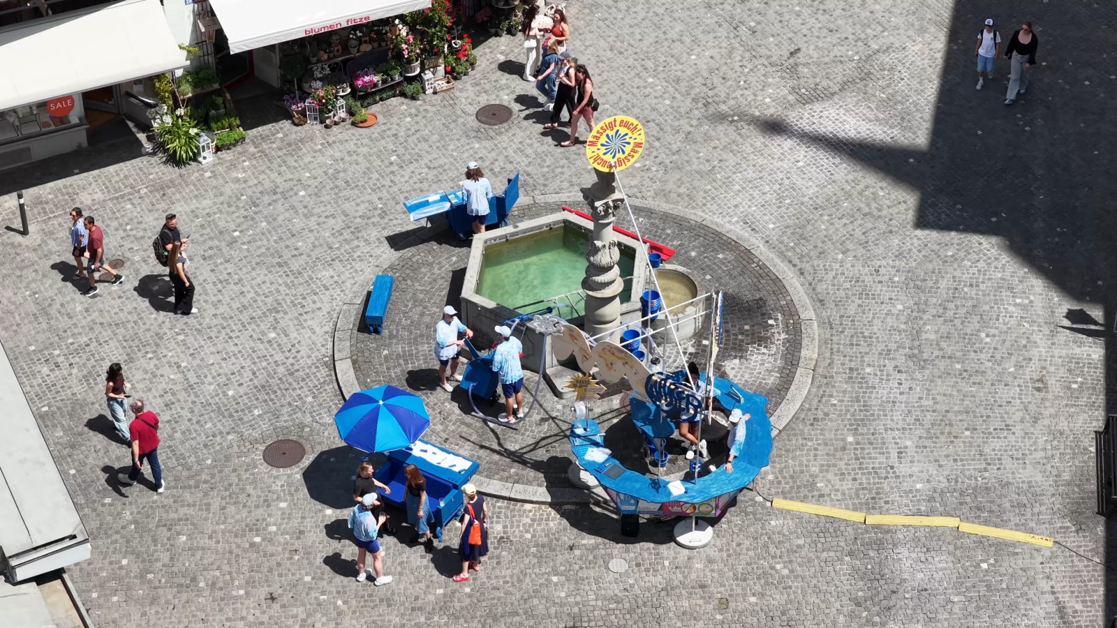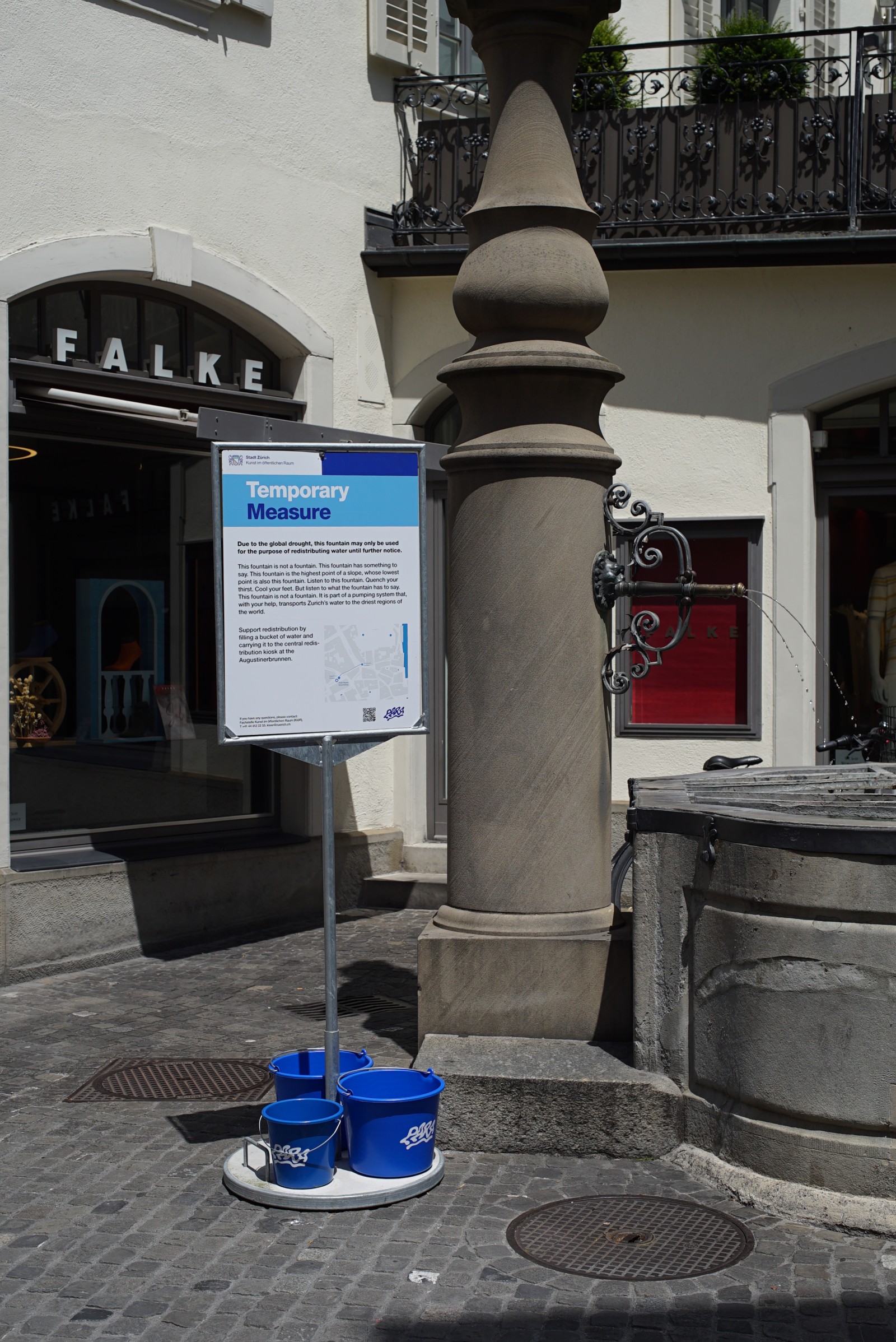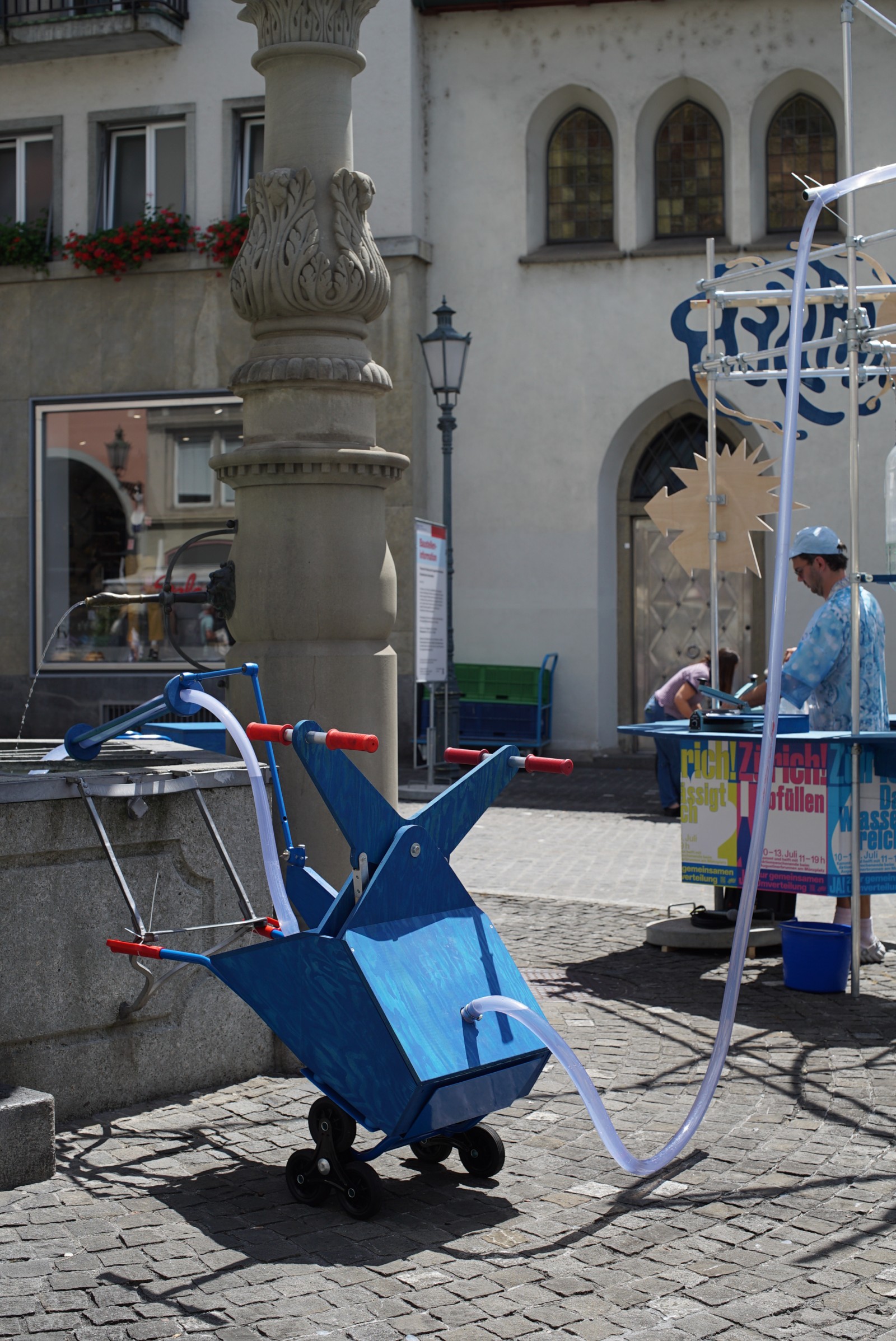 After the Augustiner fountain on Zurich's Münzplatz splashed water not into its spout but all over the world for a few days, we dismantle the redistribution equipment, load it into our van and drive off... Wait. First, we pump out as much water as will fit into our overloaded rental truck and take it across the border, hidden in barrels. In Friedrichshafen on Lake Constance, water levels are now at a record low, and there is a €10,000 fine for extracting water from the lake's tributaries. Continue to: The impossibility of sharing (part 3).