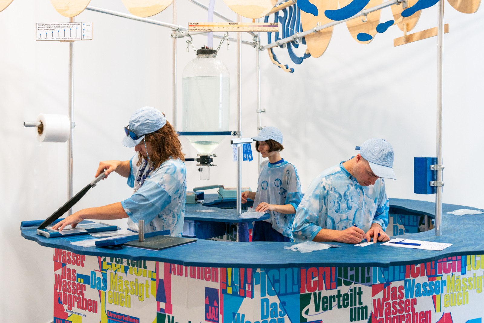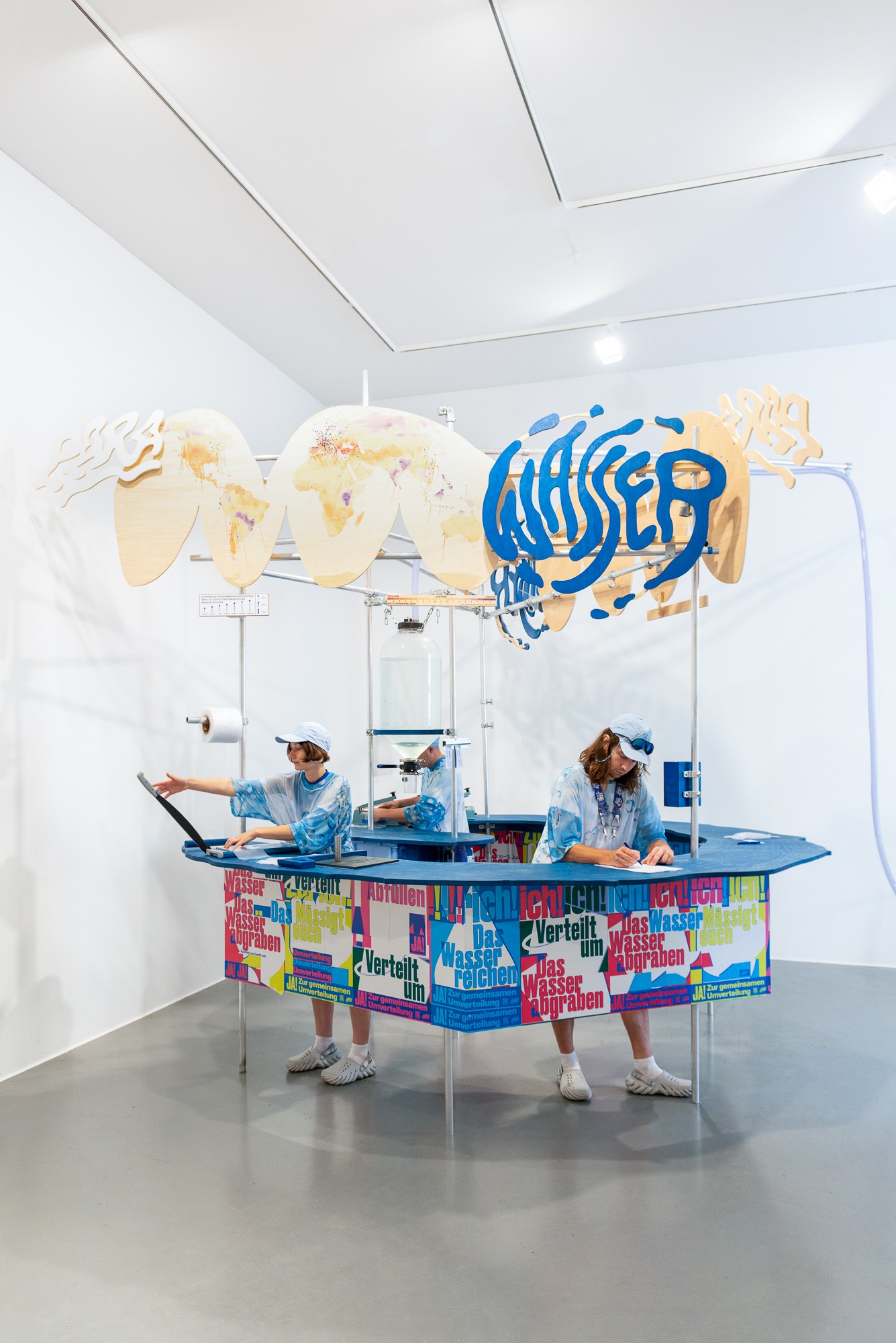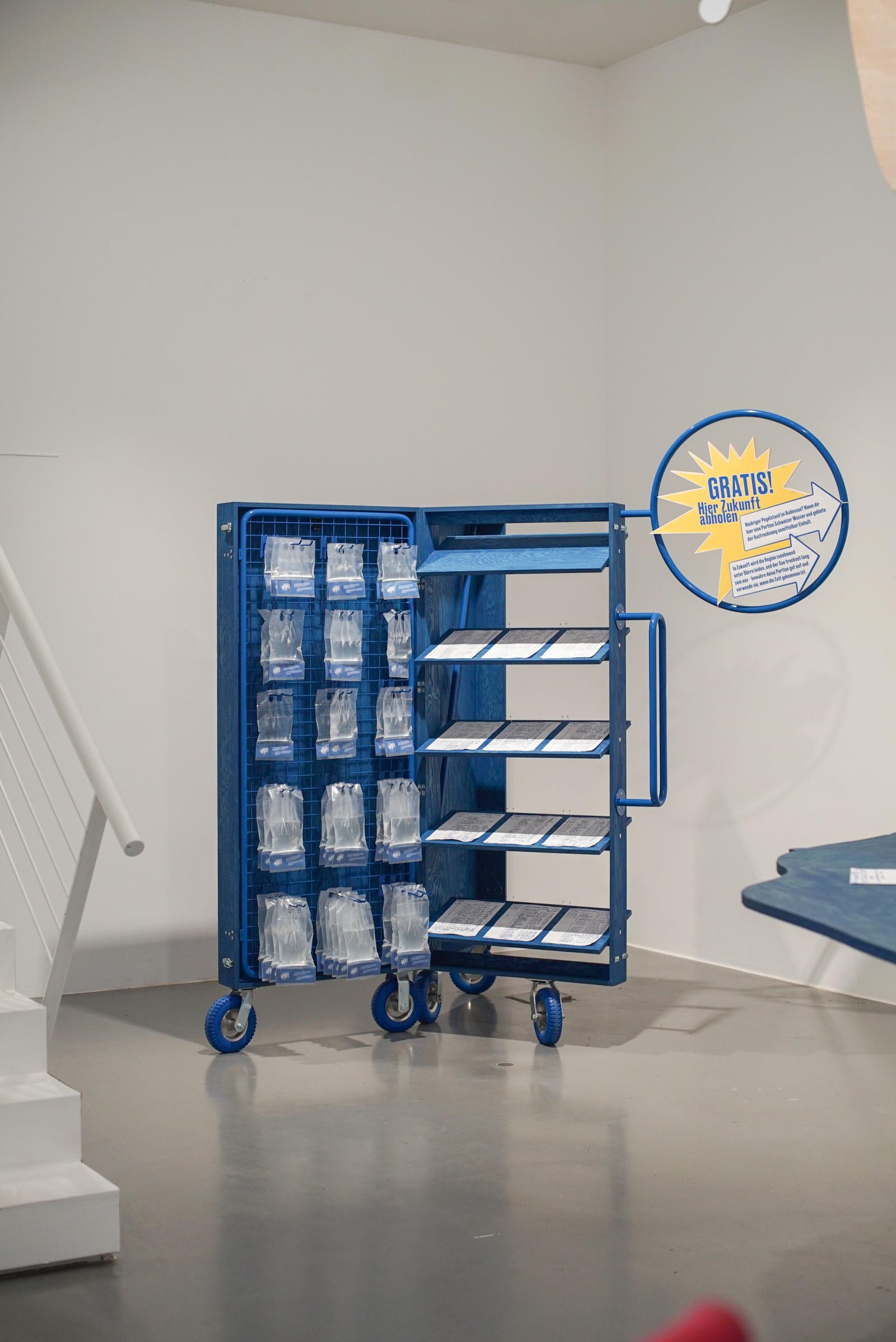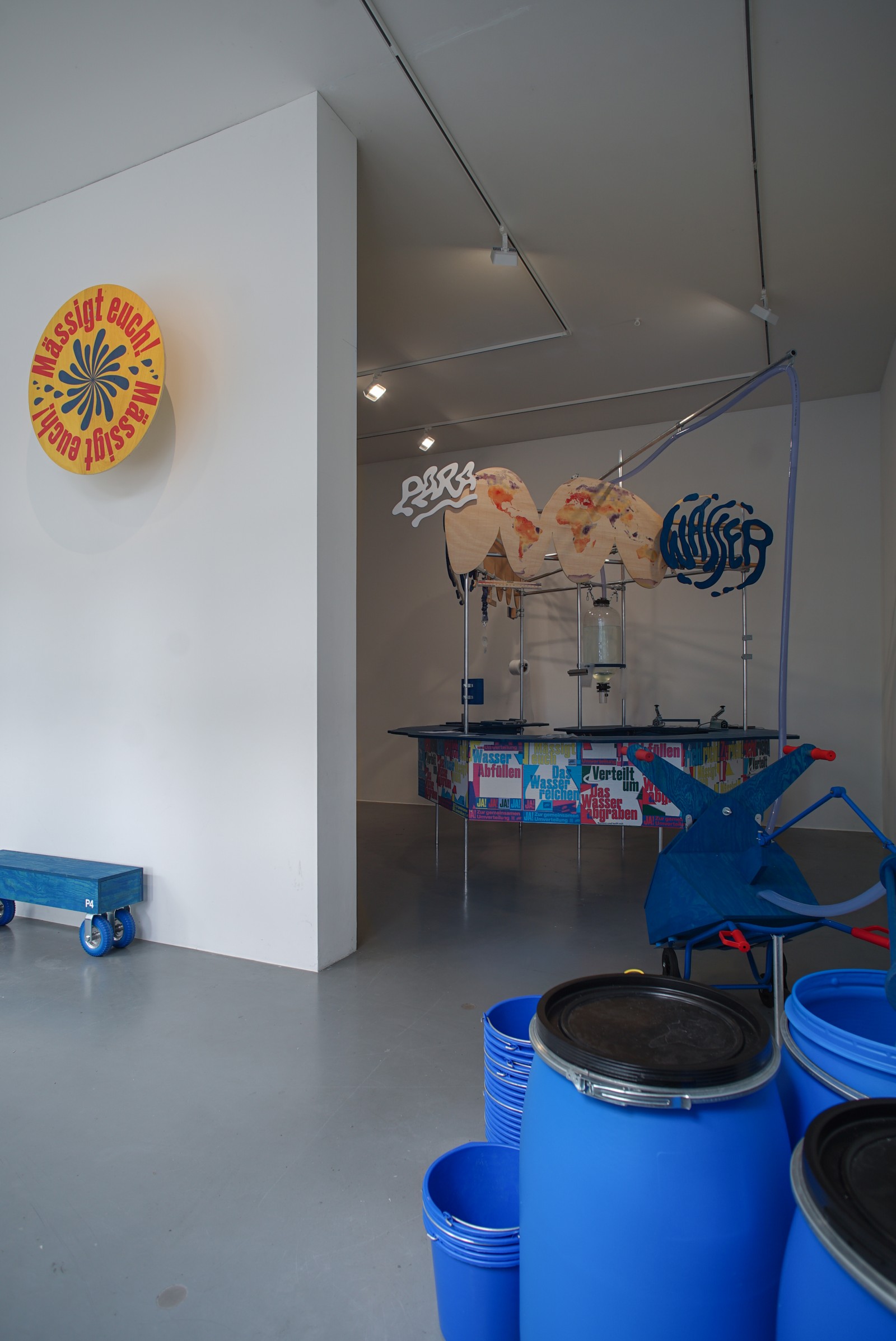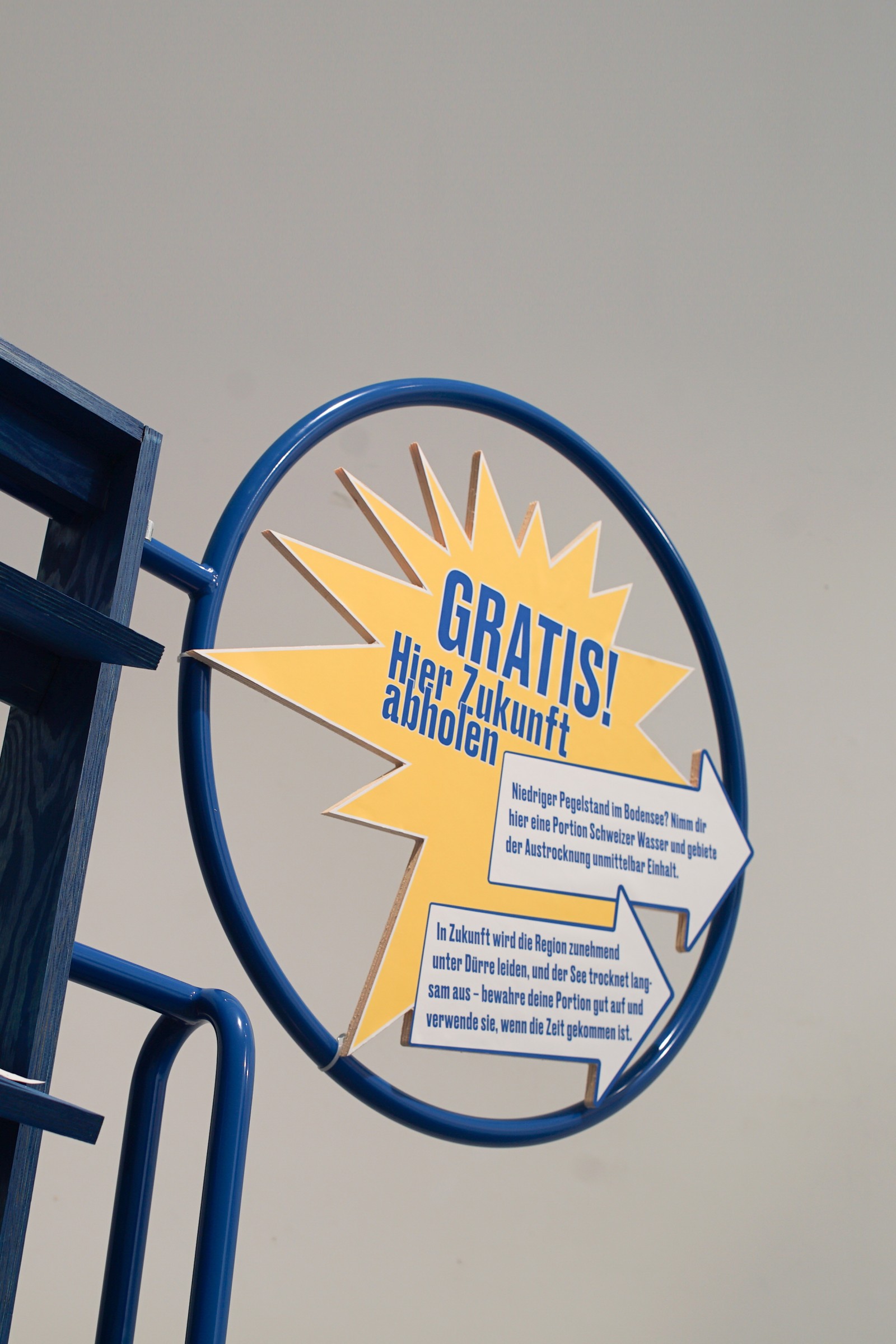 Im Kunstverein Friedrichshafen wird das Wasser aus Zürich gemeinsam mit den Besucher*innen der Ausstellung dem Bodensee zugeführt, um den Pegel wieder steigen zu lassen. Außerdem zeigt die Ausstellung die Dokumentation der Kampagne. Auf der Weltkarte sind die Wasserrationen zu sehen, die auf sich auf dem Weg zu ihrer Destination befinden. Manche sind nur wenige Stunden unterwegs, andere werden erst in 50+ Jahren eintreffen.