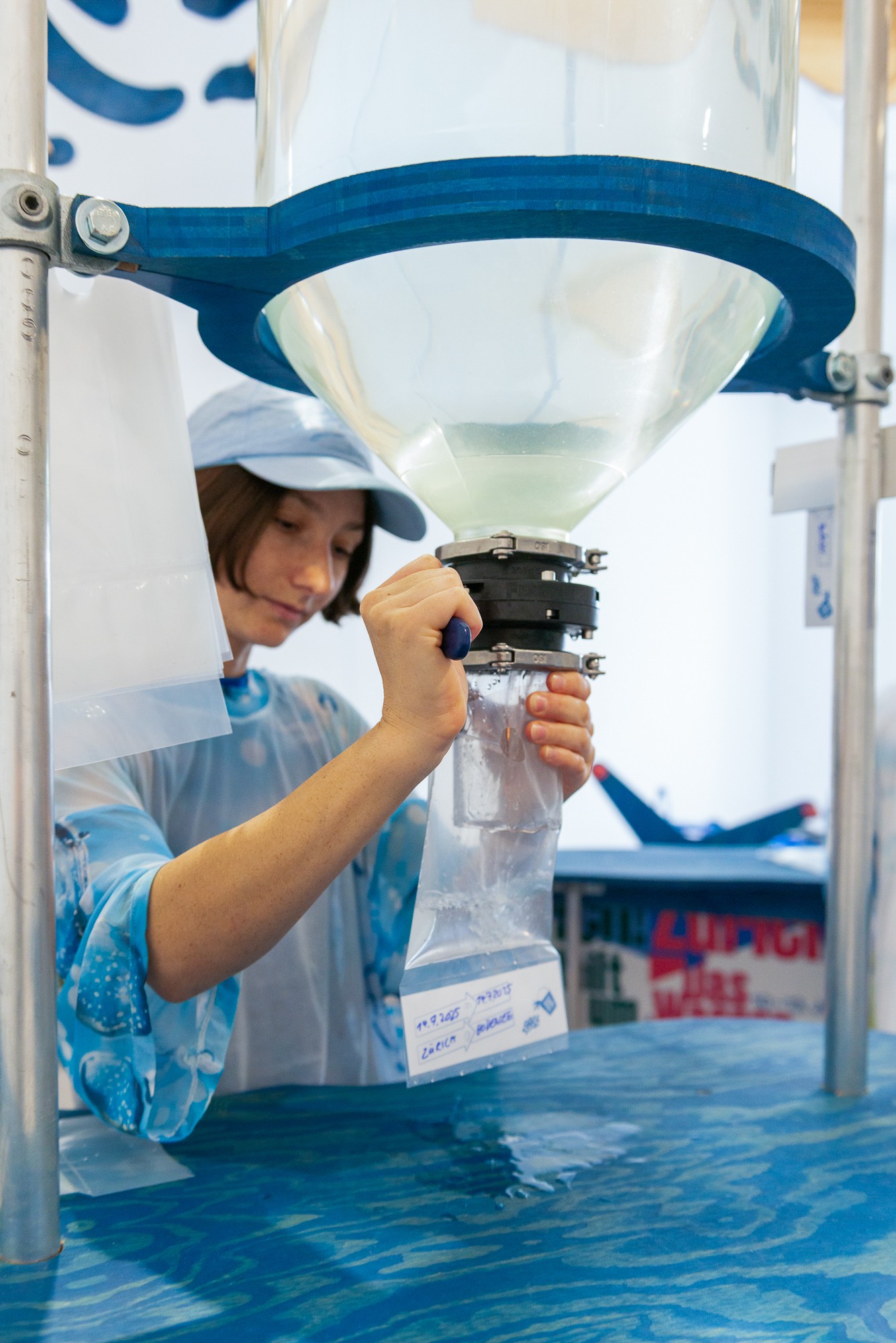 Ein Display lädt die Besucher außerdem dazu ein, sich abgefüllte und vordatierte Beutel mit dem Zürcher Wasser mitzunehmen. Destination: Bodensee, oder wo es benötigt wird.