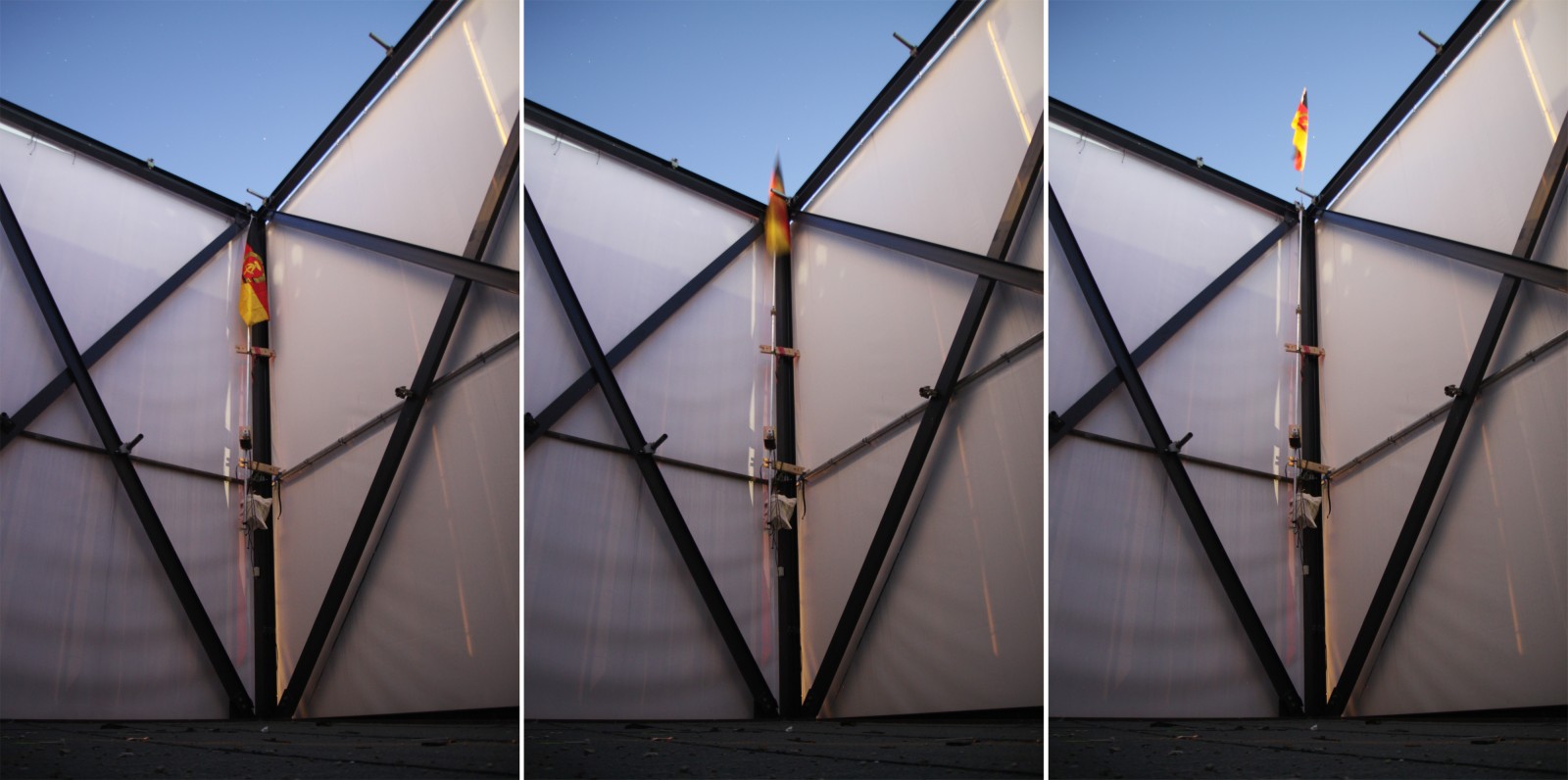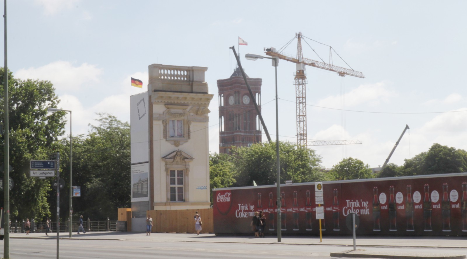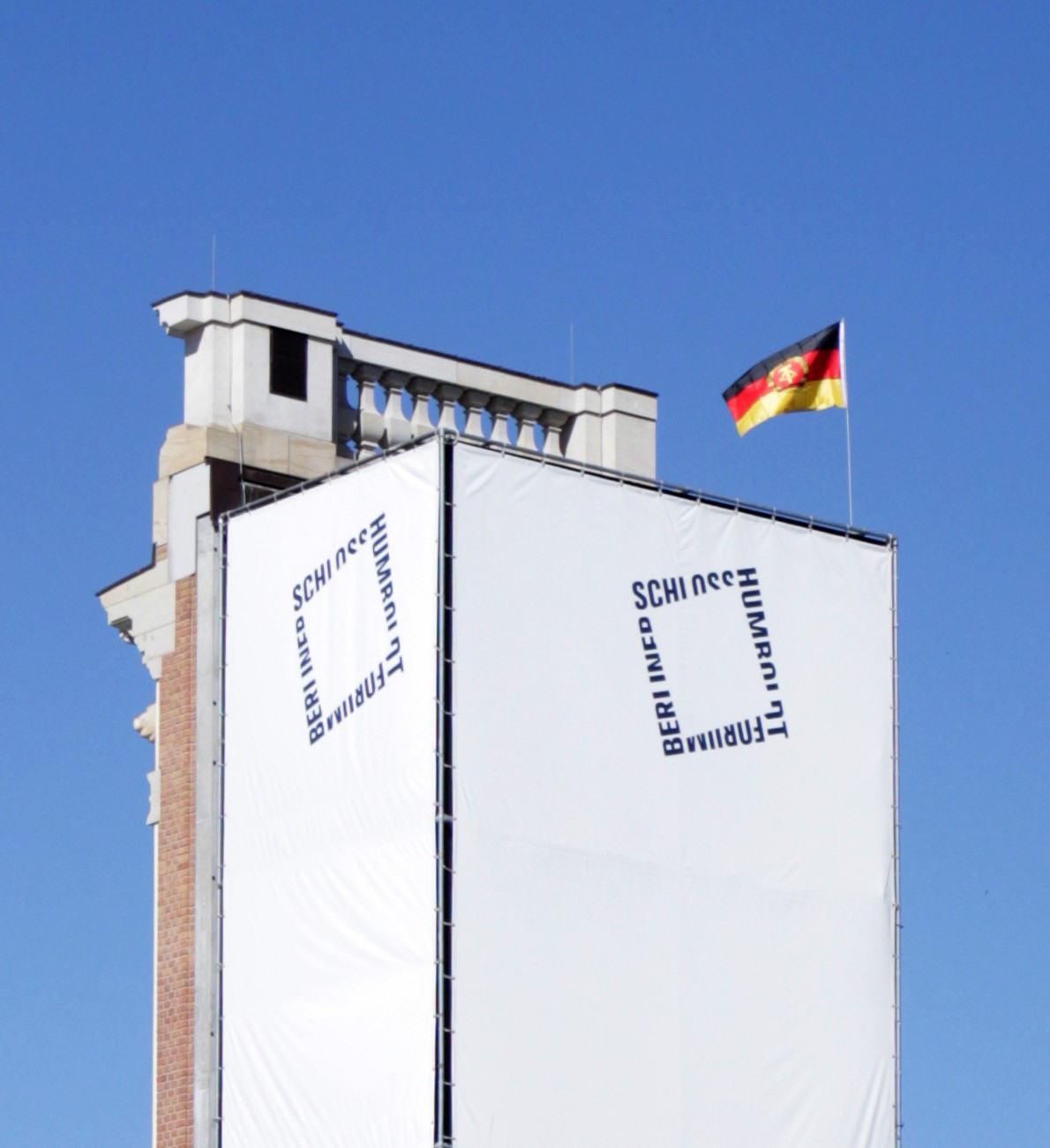 Intervention ― Peter Behrbohm and Anton Steenbock (SONDER) ― aluminum tubes, rope, microcontroller, East German flag ― dimensions changing ― sample facade of the Prussian castle that was rebuilt between 2013-20, at the site of the socialist Palace of the Republic, Berlin 2013-?