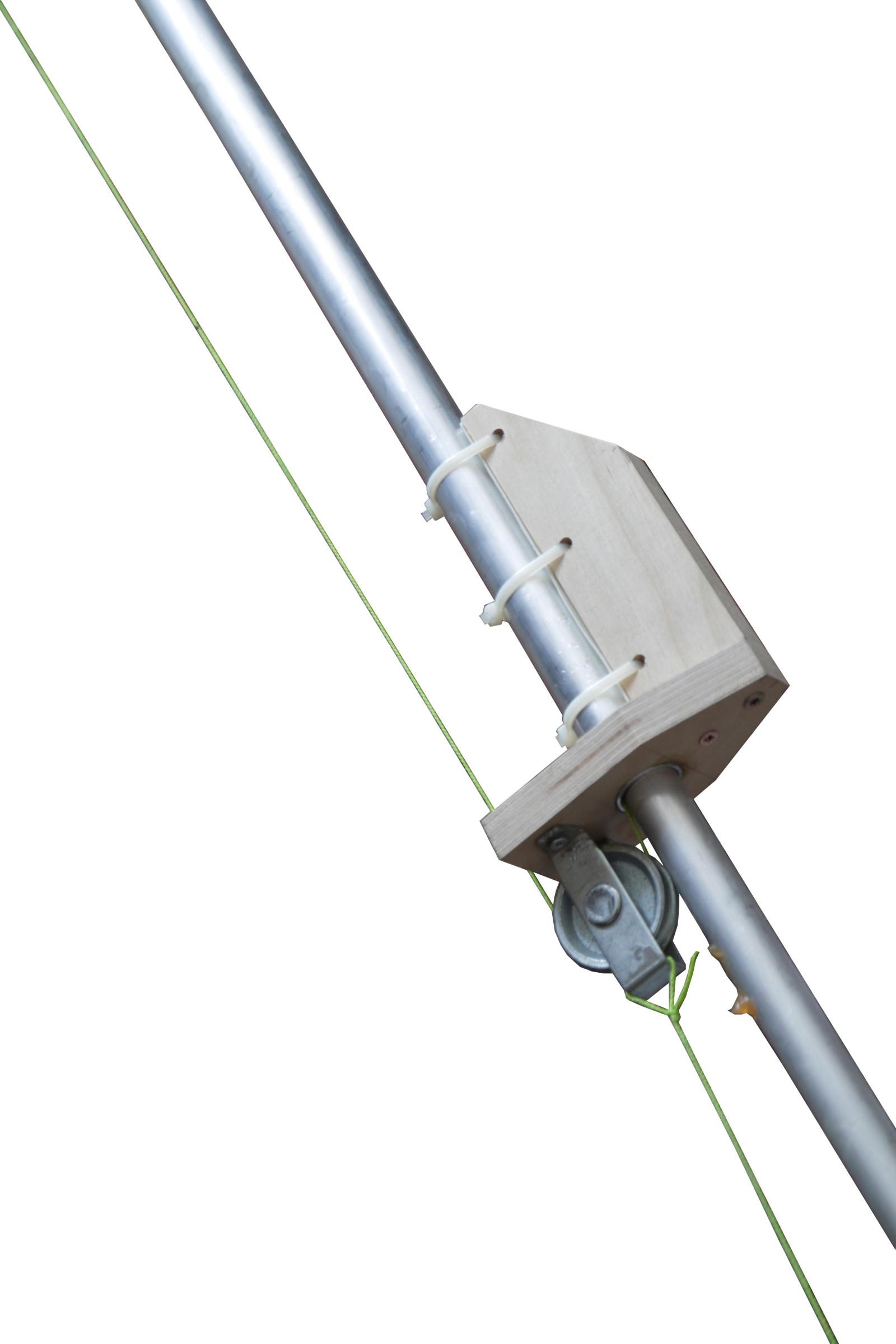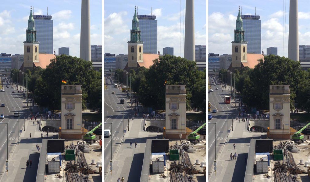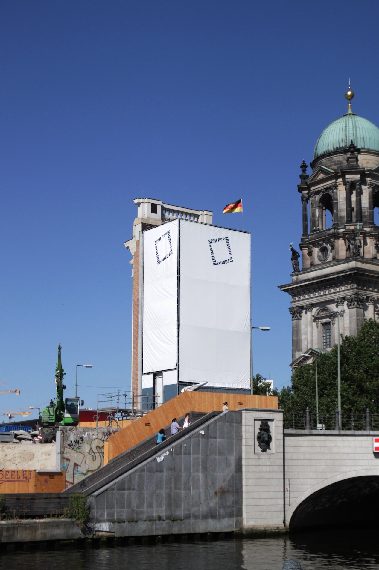 Intervention ― Peter Behrbohm and Anton Steenbock (SONDER) ― aluminum tubes, rope, microcontroller, East German flag ― dimensions changing ― sample facade of the Prussian castle that was rebuilt between 2013-20, at the site of the socialist Palace of the Republic, Berlin 2013-?