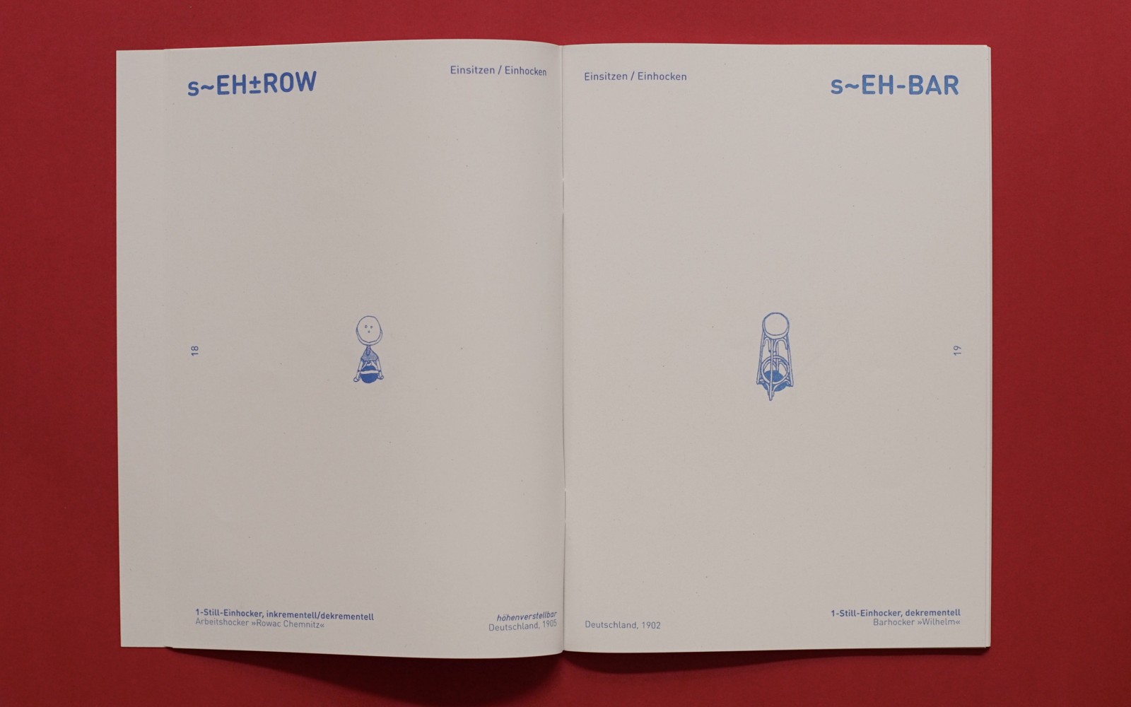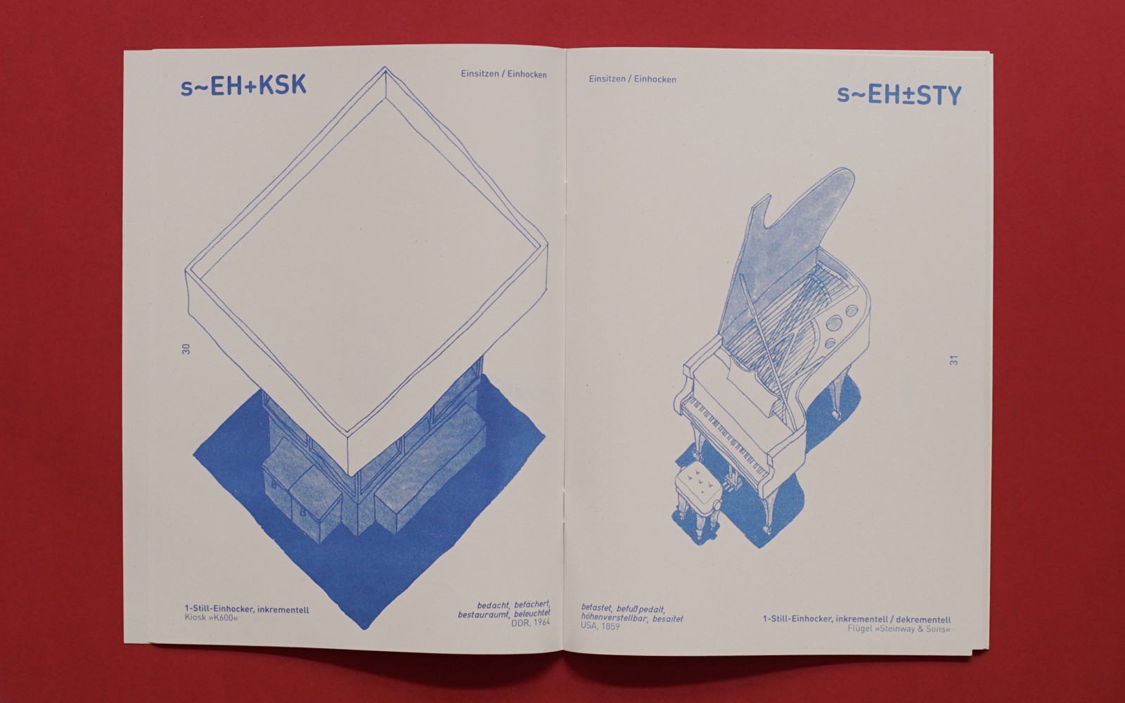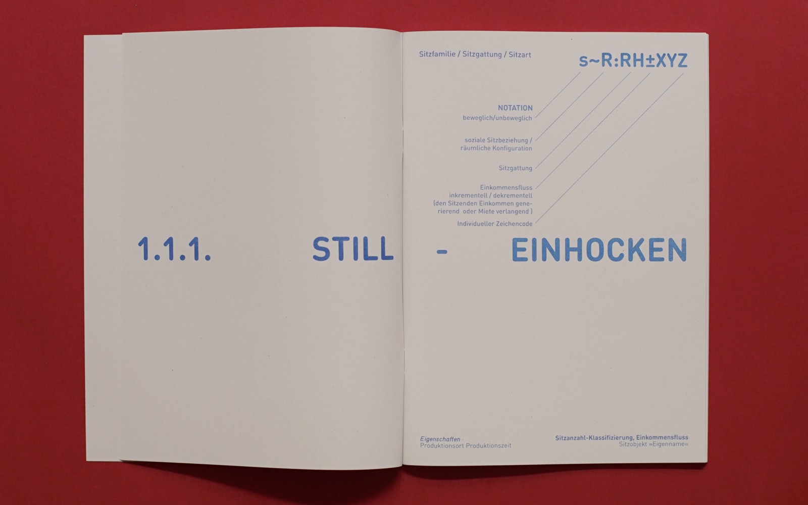 The research Unit at Reileck continues the institute's visual analysis and taxonomic classification of regional sitting practices while publishing the »Encyclopædia on Specialised Sitting«. The following editions are available at the institutes website: