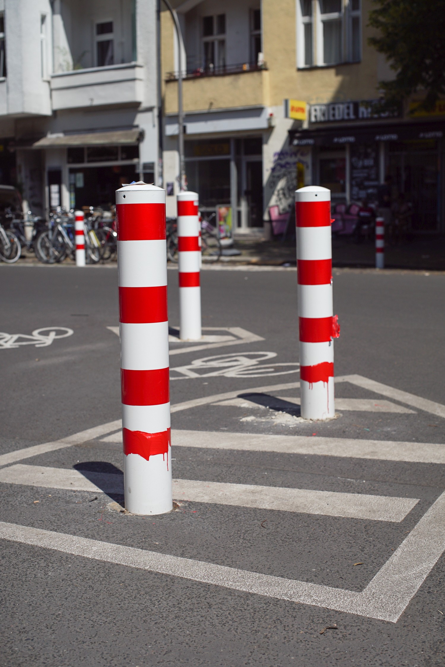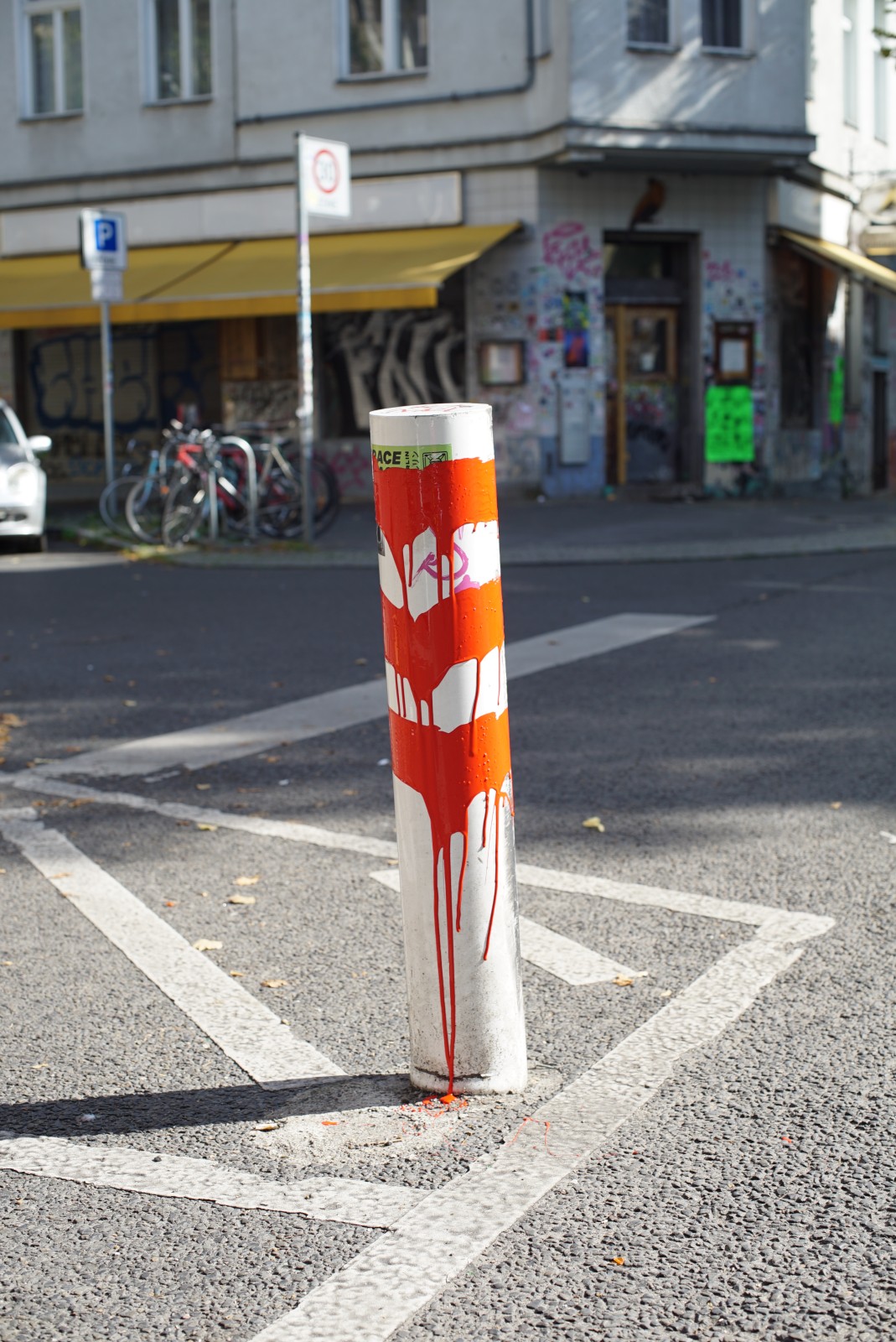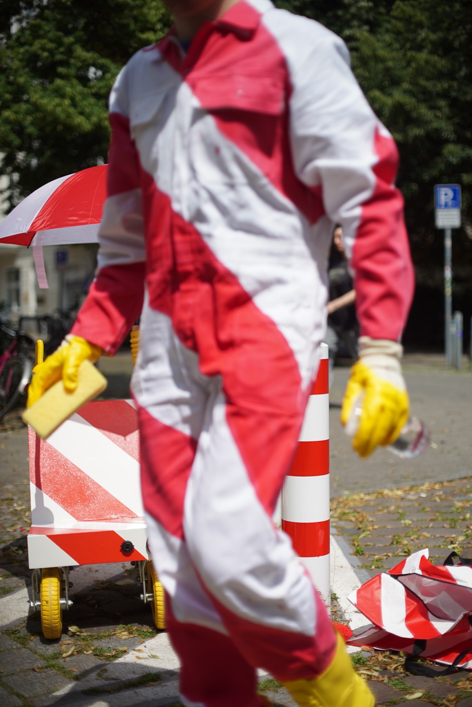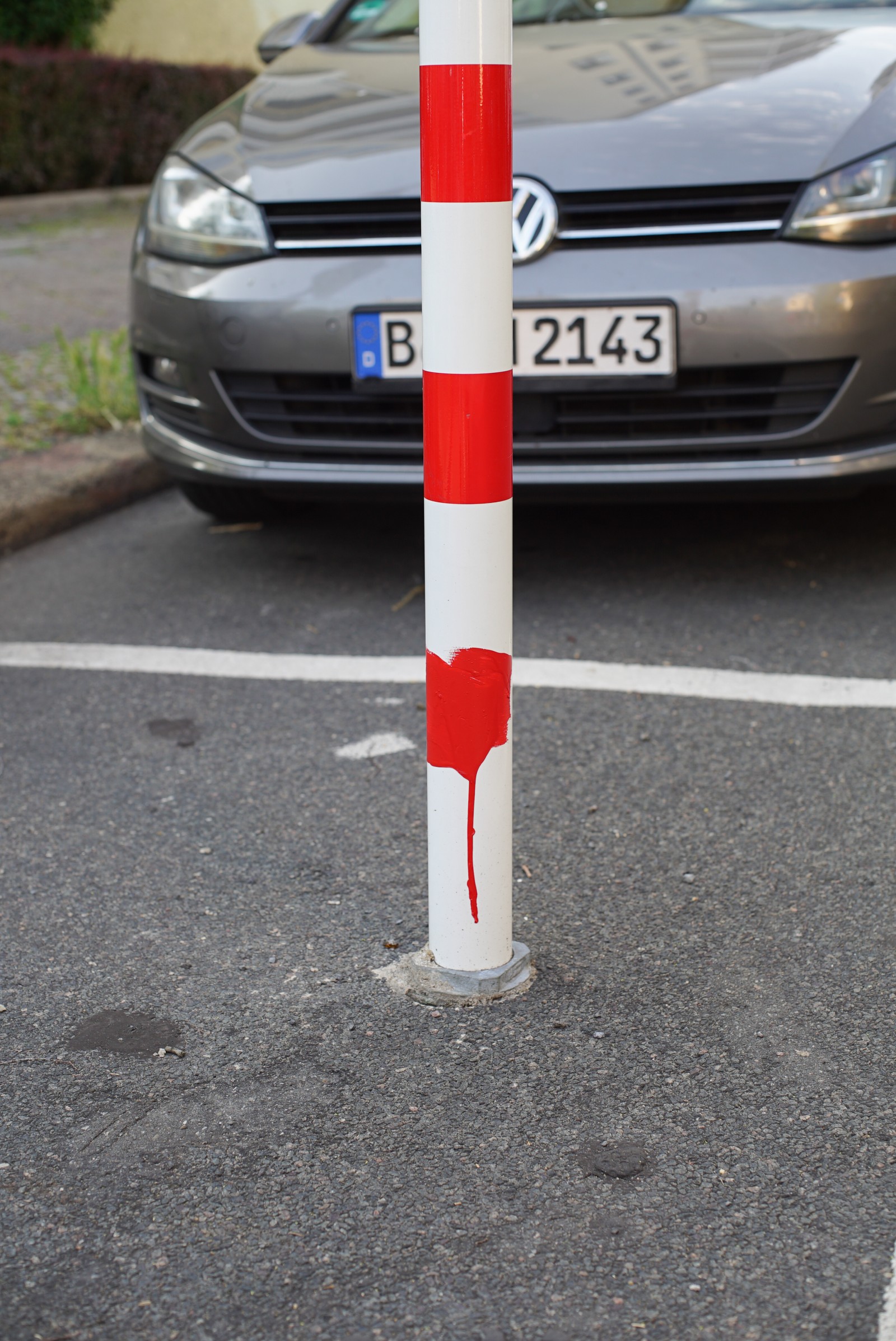 An employee wearing high-visibility clothes with red and white stripes, yellow rubber boots and a hard hat is on duty throughout the city. He sits on a small, striped vehicle equipped with six off-road tyres, inspection lights, flashing warning lights and a parasol. The vehicle slowly moves backwards along the curb, and the employee keeps a watchful eye out – and soon he passes a group of bollards with red and white stripes that look as if they have recently been cuddled by a sports car. He adjusts his inspection light, measures the distance between the red and white stripes, notes their condition, and reaches for his brushes and cleaning supplies. Then he notices that the carefully concreted and equally carefully knocked over steel pipe no longer has all its stripes on the shaft. He takes a paint bucket of traffic red RAL 3020 out of his red and white striped bag. With a thick brush, he splatters on the missing stripes. To be on the safe side, he adds another one, the red paint running down the bent post in long drips. This is about safety. About attention. And, as we know, attention increases in proportion to the number of stripes on the warning device. In other words, every stripe saves lives here. And stripes with drips are even more noticeable than those without.