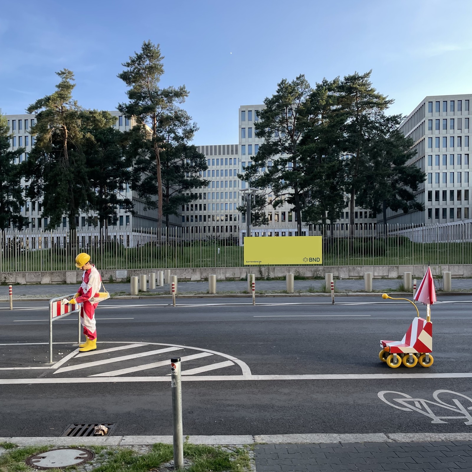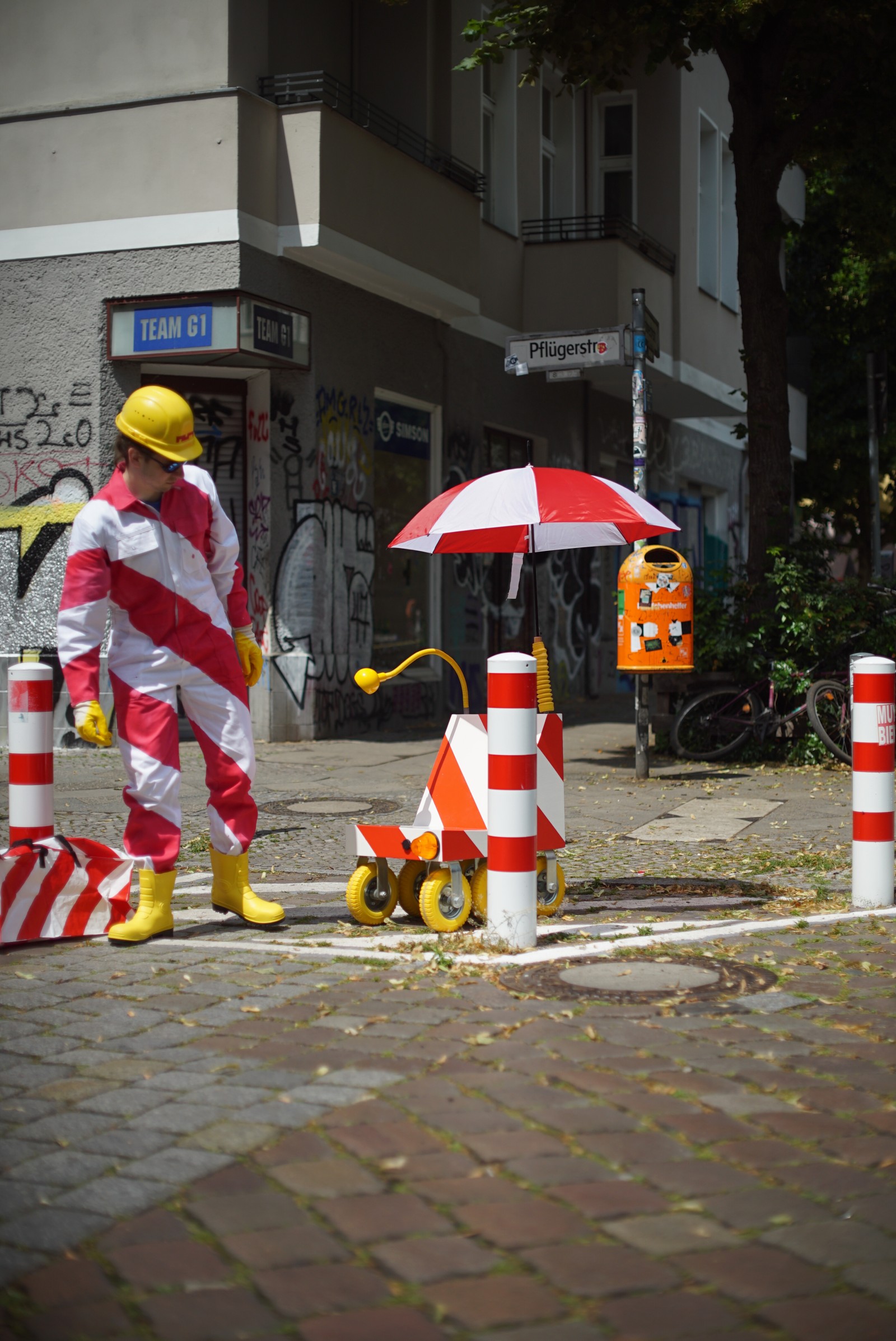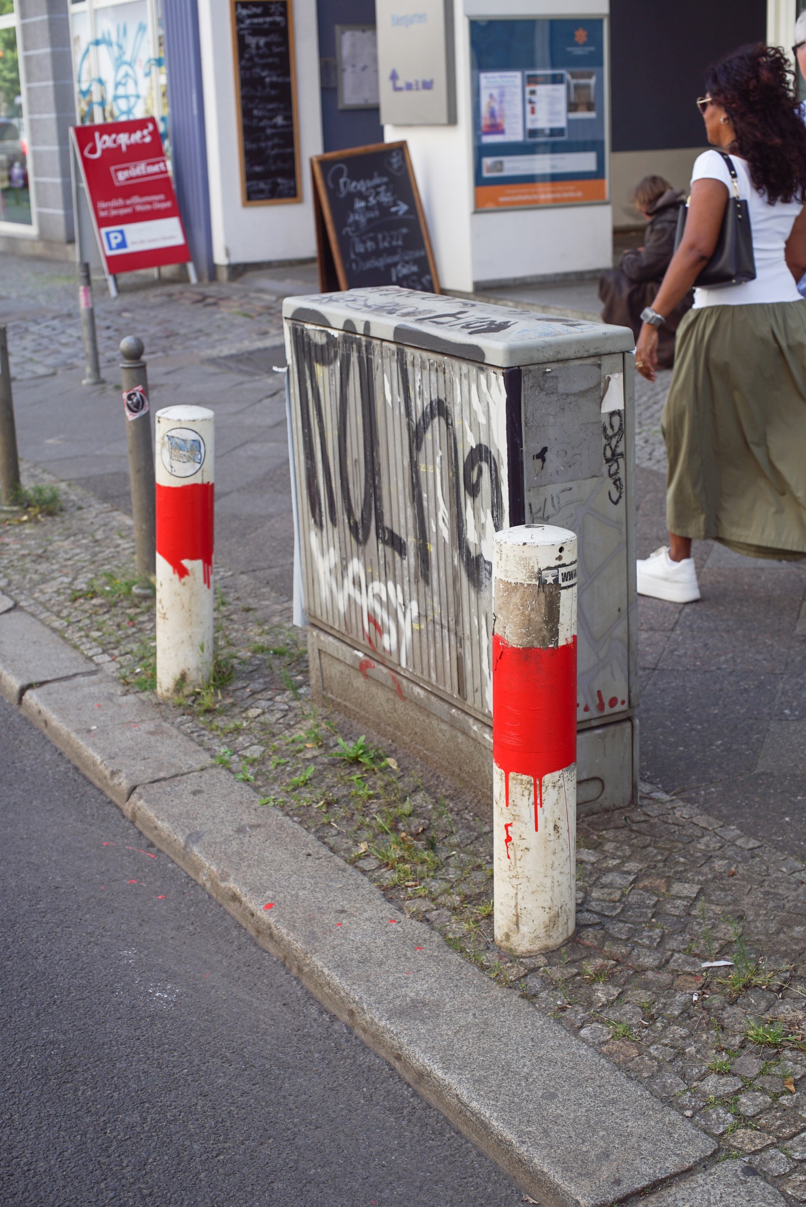 An employee wearing high-visibility clothes with red and white stripes, yellow rubber boots and a hard hat is on duty throughout the city. He sits on a small, striped vehicle equipped with six off-road tyres, inspection lights, flashing warning lights and a parasol. The vehicle slowly moves backwards along the curb, and the employee keeps a watchful eye out – and soon he passes a group of bollards with red and white stripes that look as if they have recently been cuddled by a sports car. He adjusts his inspection light, measures the distance between the red and white stripes, notes their condition, and reaches for his brushes and cleaning supplies. Then he notices that the carefully concreted and equally carefully knocked over steel pipe no longer has all its stripes on the shaft. He takes a paint bucket of traffic red RAL 3020 out of his red and white striped bag. With a thick brush, he splatters on the missing stripes. To be on the safe side, he adds another one, the red paint running down the bent post in long drips. This is about safety. About attention. And, as we know, attention increases in proportion to the number of stripes on the warning device. In other words, every stripe saves lives here. And stripes with drips are even more noticeable than those without.