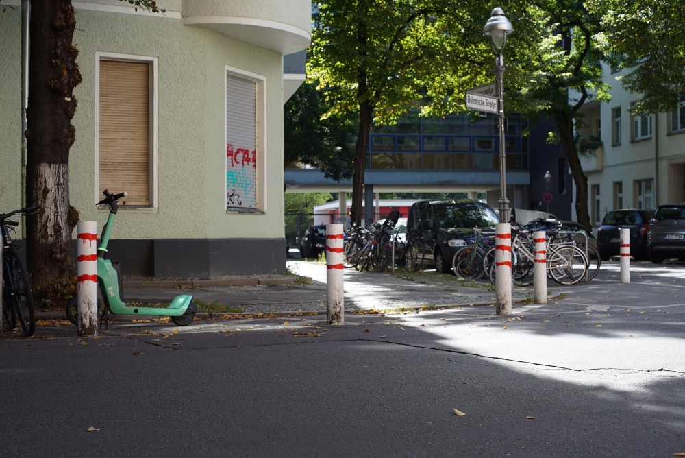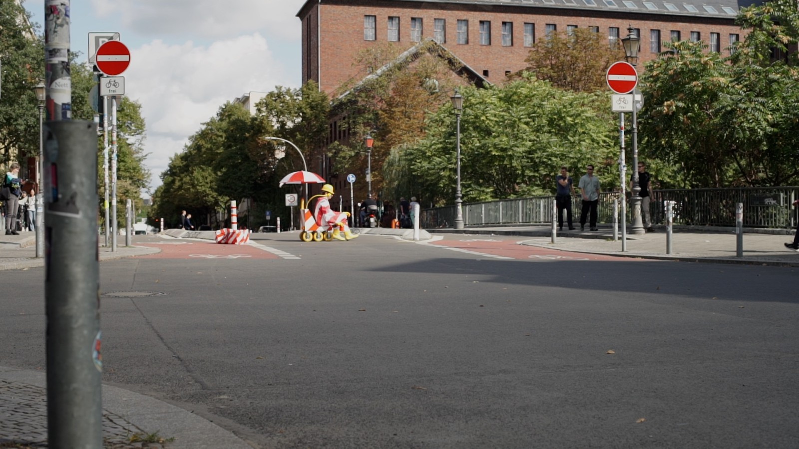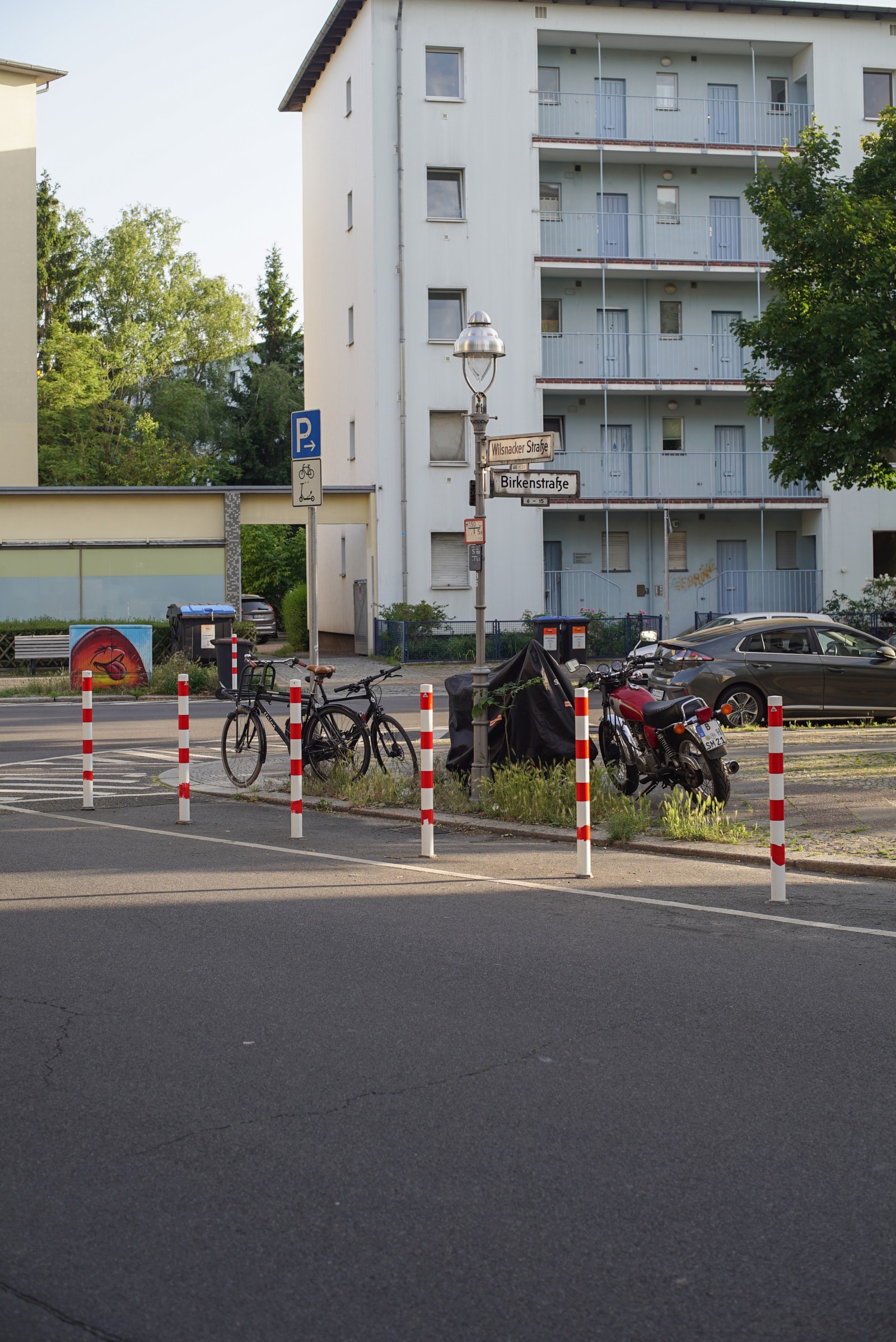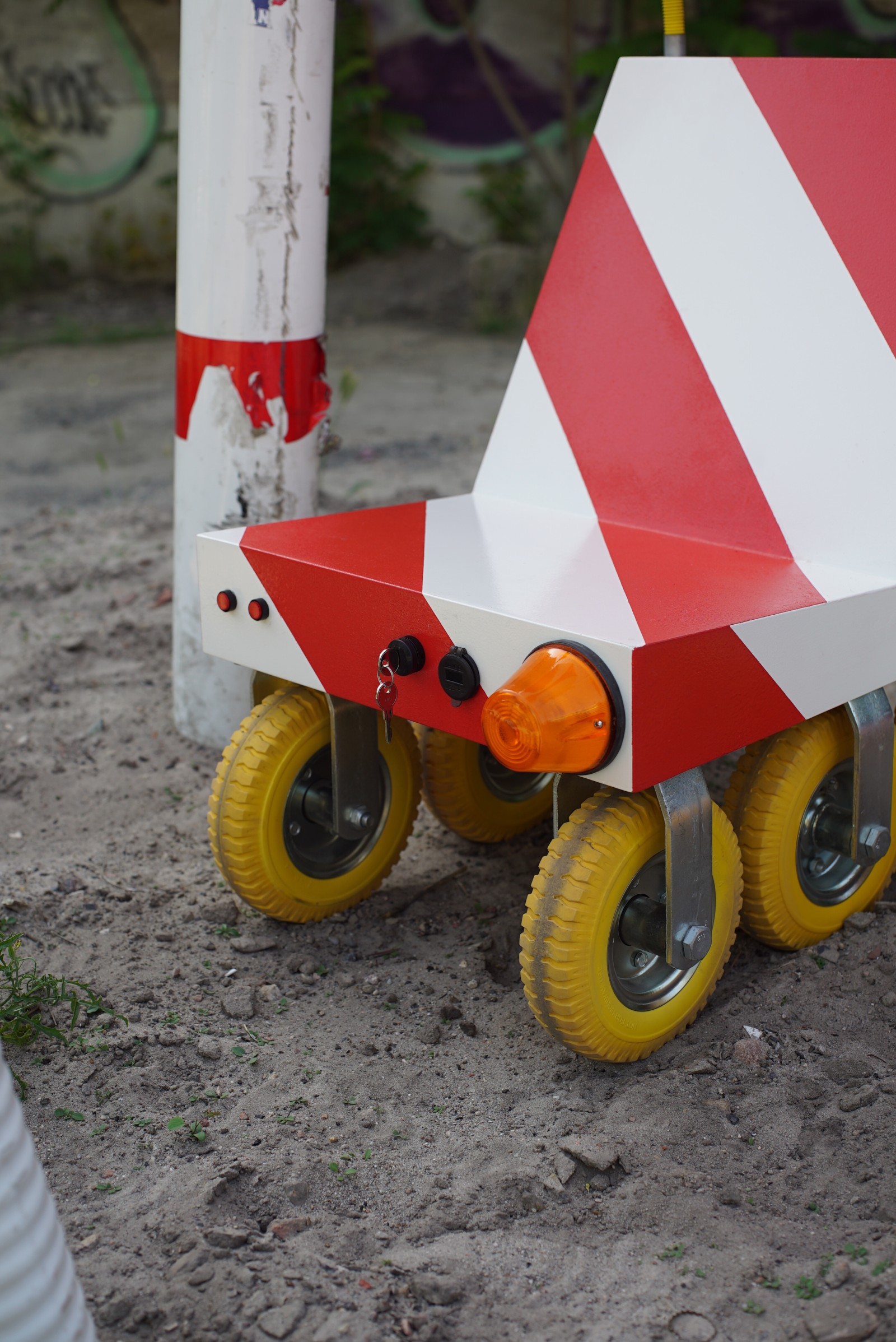 An employee wearing high-visibility clothes with red and white stripes, yellow rubber boots and a hard hat is on duty throughout the city. He sits on a small, striped vehicle equipped with six off-road tyres, inspection lights, flashing warning lights and a parasol. The vehicle slowly moves backwards along the curb, and the employee keeps a watchful eye out – and soon he passes a group of bollards with red and white stripes that look as if they have recently been cuddled by a sports car. He adjusts his inspection light, measures the distance between the red and white stripes, notes their condition, and reaches for his brushes and cleaning supplies. Then he notices that the carefully concreted and equally carefully knocked over steel pipe no longer has all its stripes on the shaft. He takes a paint bucket of traffic red RAL 3020 out of his red and white striped bag. With a thick brush, he splatters on the missing stripes. To be on the safe side, he adds another one, the red paint running down the bent post in long drips. This is about safety. About attention. And, as we know, attention increases in proportion to the number of stripes on the warning device. In other words, every stripe saves lives here. And stripes with drips are even more noticeable than those without.