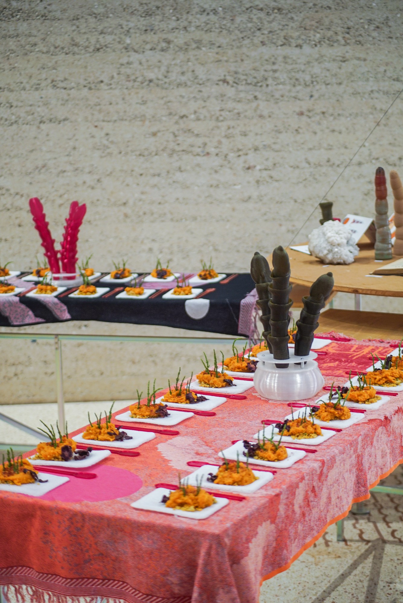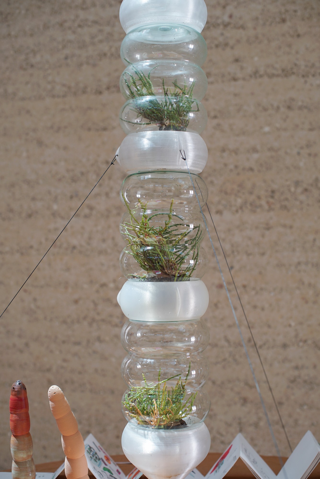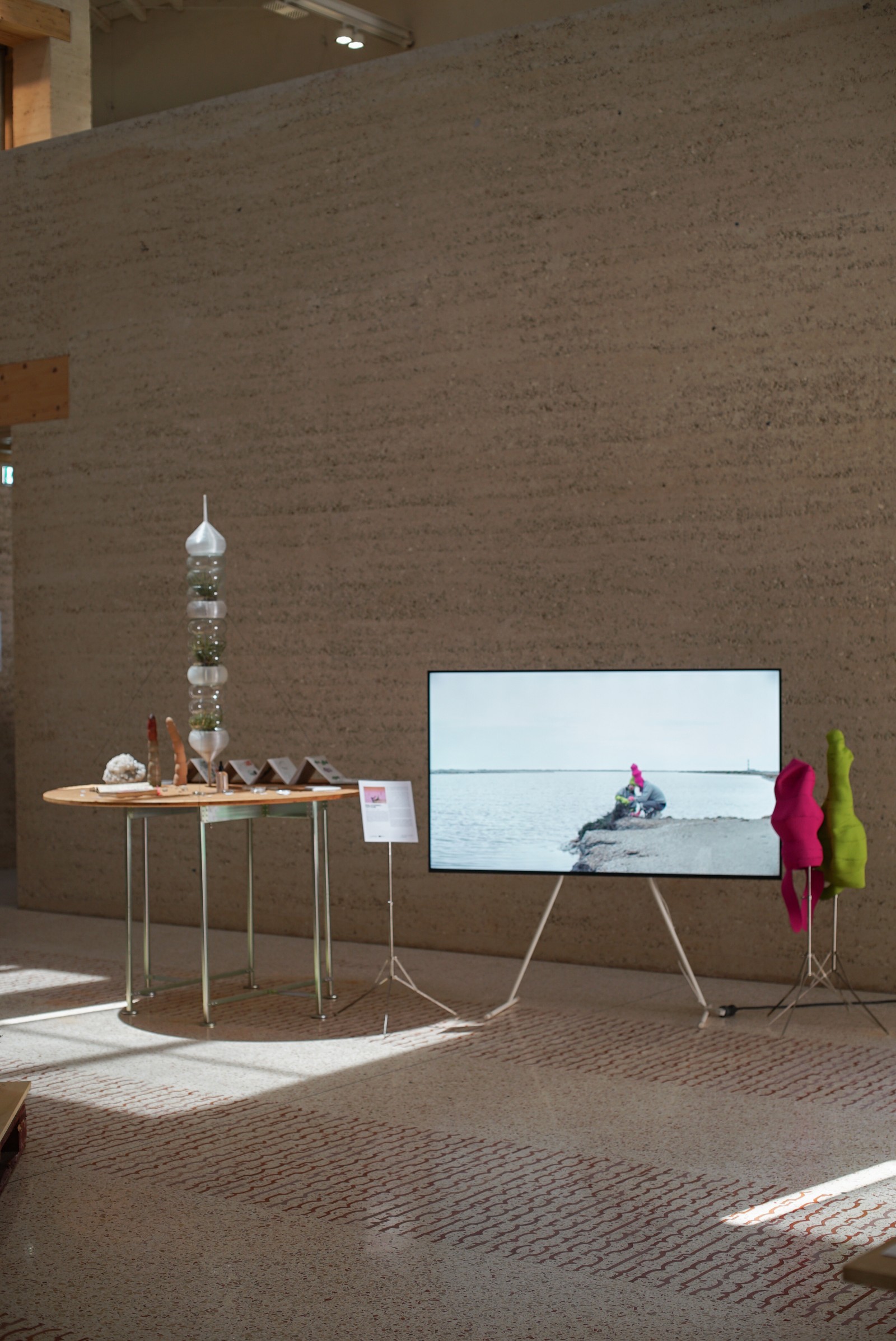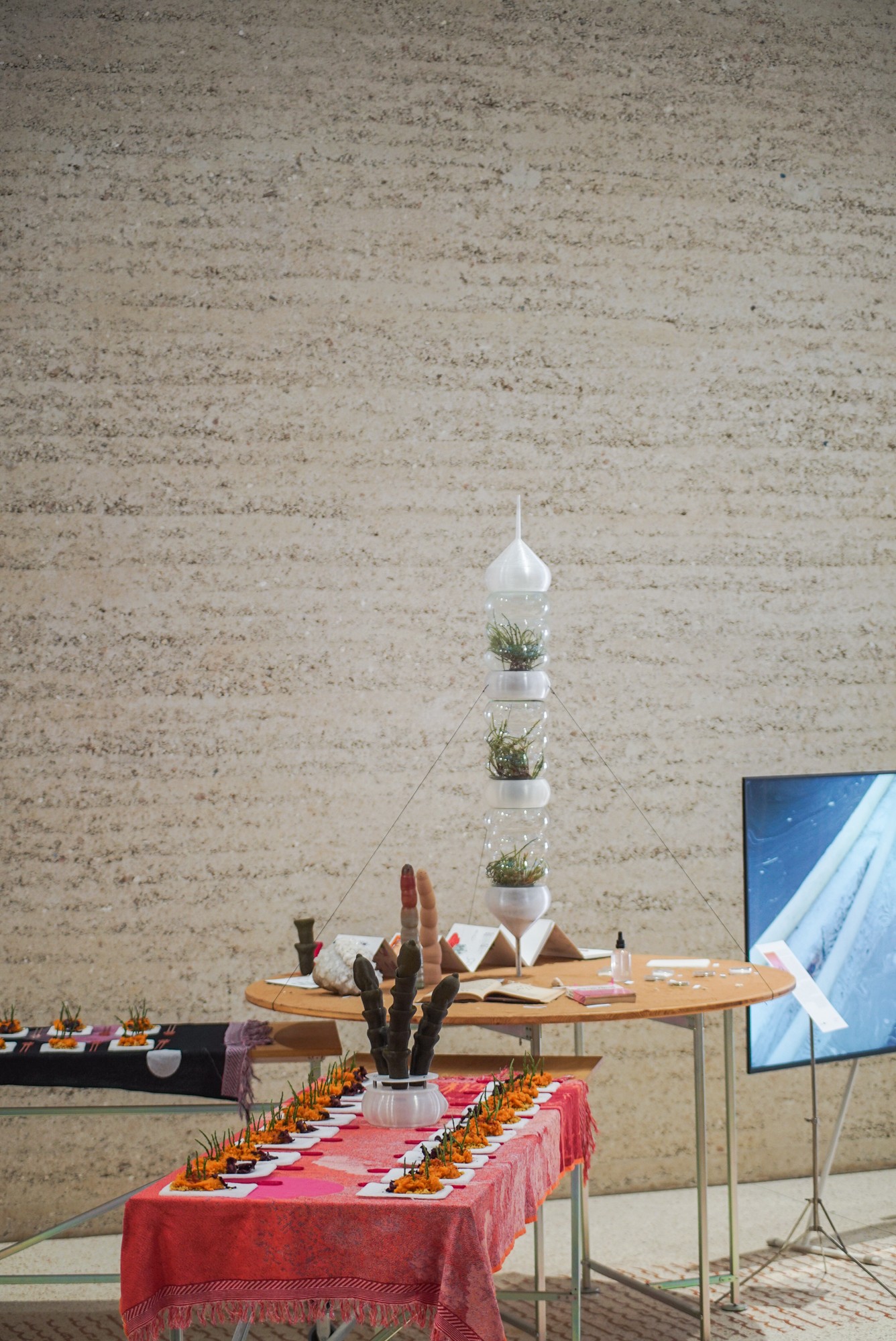 This results in Salicornia-shaped wetsuits that allow the wearer to get closer to the delicate plants in the wild. A film, an installation and a dinner performance all revolving around Salicornia. Everything is made from materials that can be produced from Salicornia. Based on the glass cities, houses and factories of Mars, we design vertical greenhouses from the material that for centuries could only be produced with the help of Salicornia. The plates are made from a foam based on salt and Salicornia ash. The glasses and tweezers spoons are made from a bioplastic derived from the bacteria that Salicornia cooperates with at its roots. There are Salicornia-shaped salt shakers, woven tablecloths with Salicornia patterns, and on the table covered with Martian sand lies the first edition of Tektologie from 1913. Finally, 33 invited guests at the Magasin Electrique on the LUMA Arles site enjoy an experimental dinner, where small models of Salicornia are eaten with Martian sand, while Salicornia cocktails are served to toast the Salicornication.