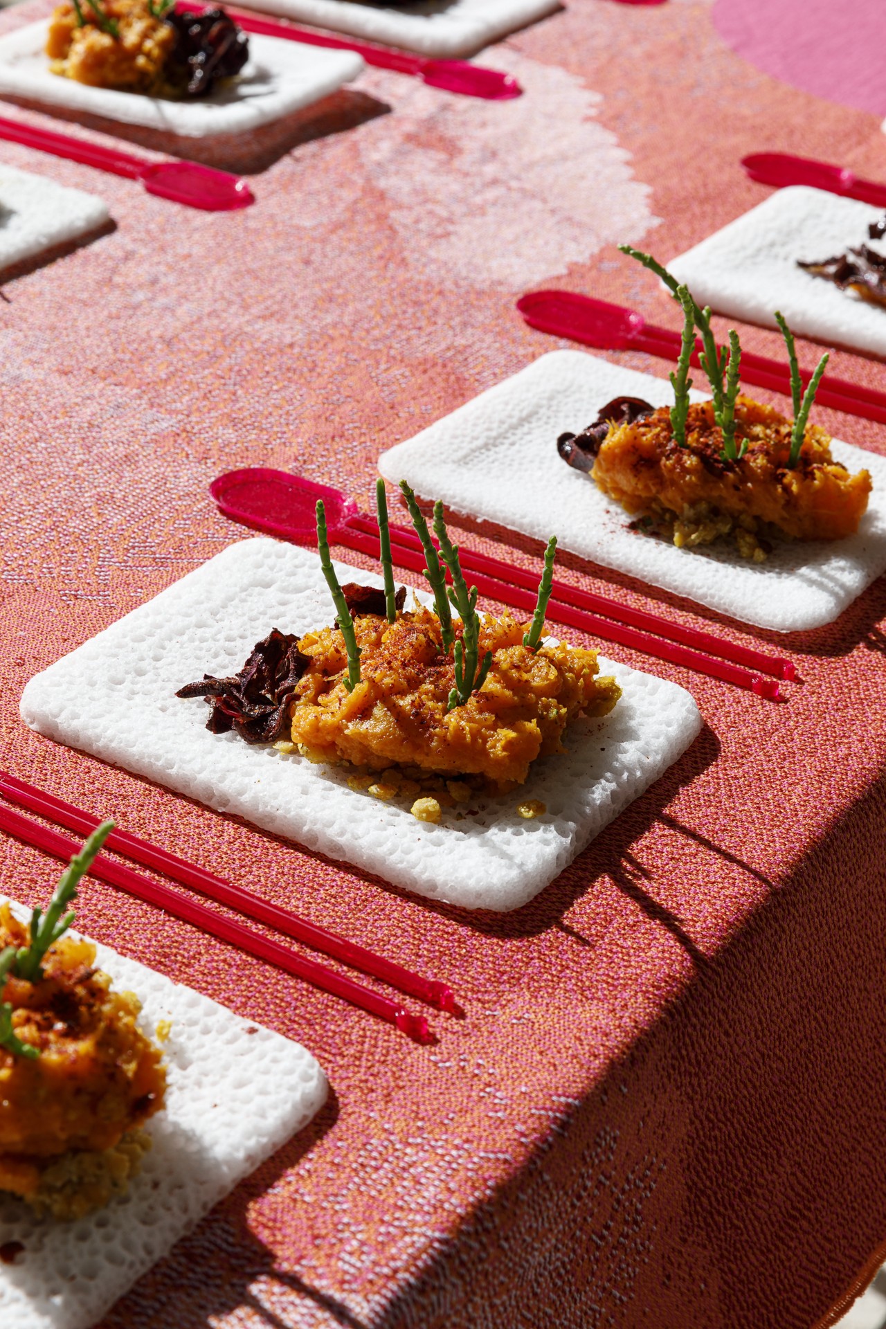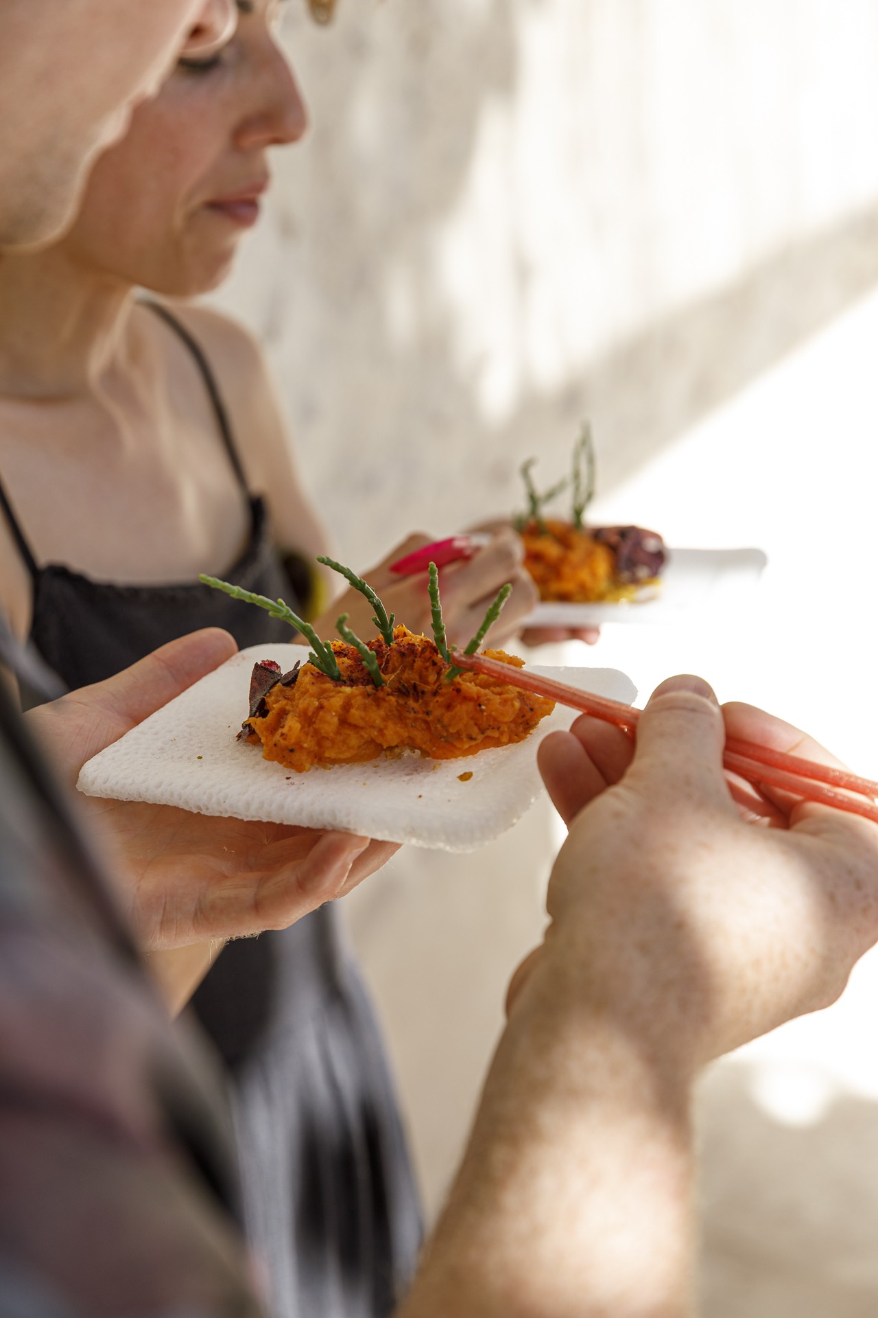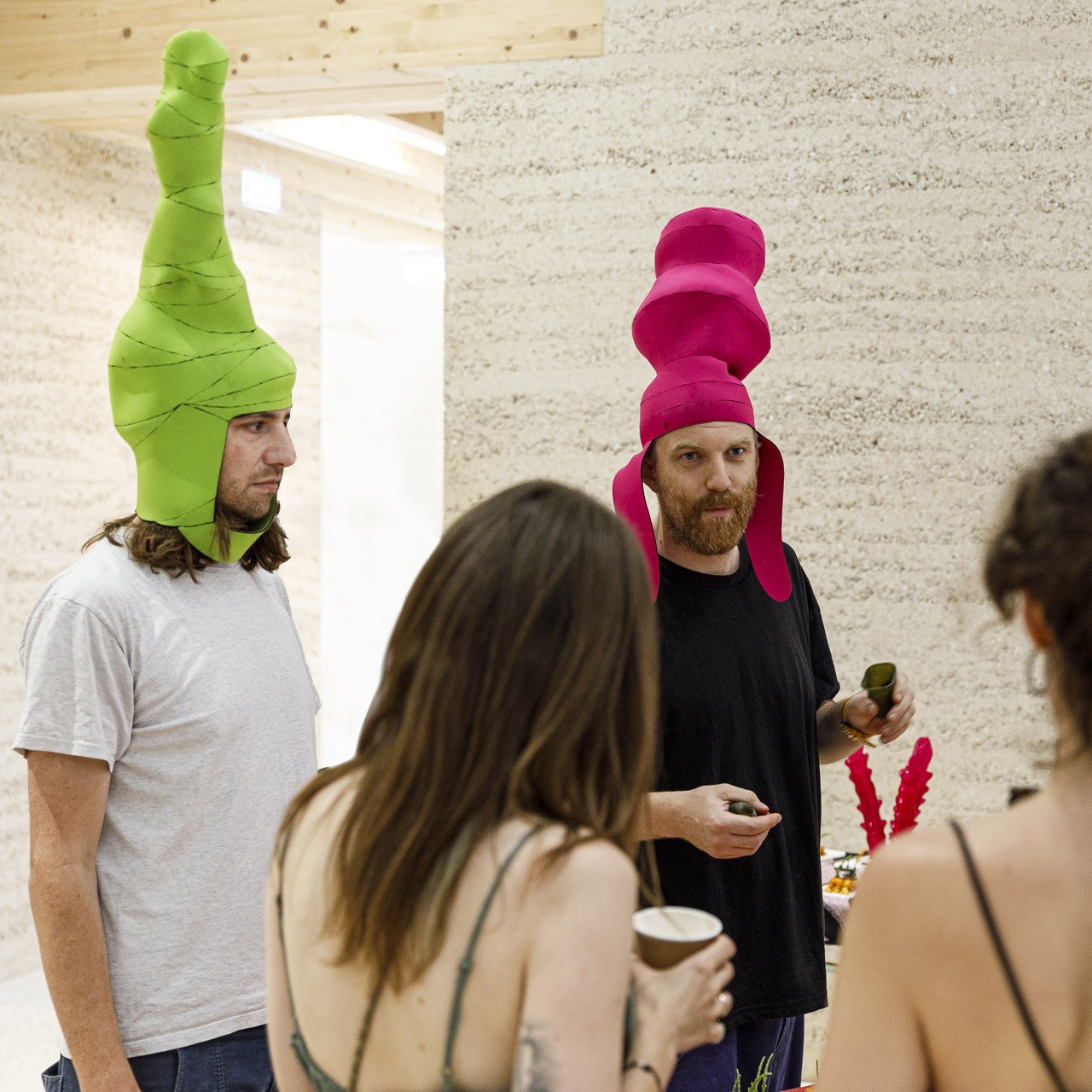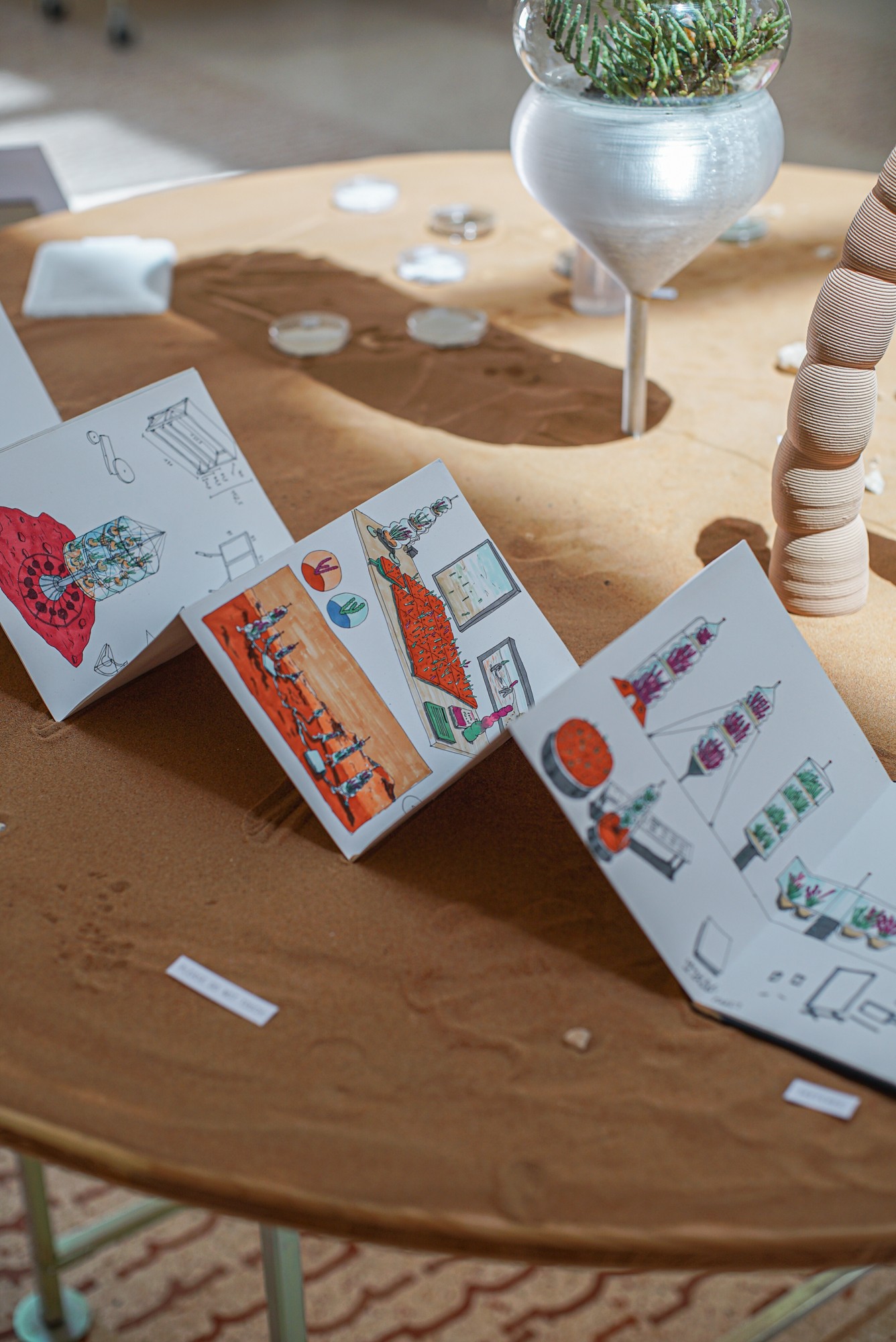 This results in Salicornia-shaped wetsuits that allow the wearer to get closer to the delicate plants in the wild. A film, an installation and a dinner performance all revolving around Salicornia. Everything is made from materials that can be produced from Salicornia. Based on the glass cities, houses and factories of Mars, we design vertical greenhouses from the material that for centuries could only be produced with the help of Salicornia. The plates are made from a foam based on salt and Salicornia ash. The glasses and tweezers spoons are made from a bioplastic derived from the bacteria that Salicornia cooperates with at its roots. There are Salicornia-shaped salt shakers, woven tablecloths with Salicornia patterns, and on the table covered with Martian sand lies the first edition of Tektologie from 1913. Finally, 33 invited guests at the Magasin Electrique on the LUMA Arles site enjoy an experimental dinner, where small models of Salicornia are eaten with Martian sand, while Salicornia cocktails are served to toast the Salicornication.